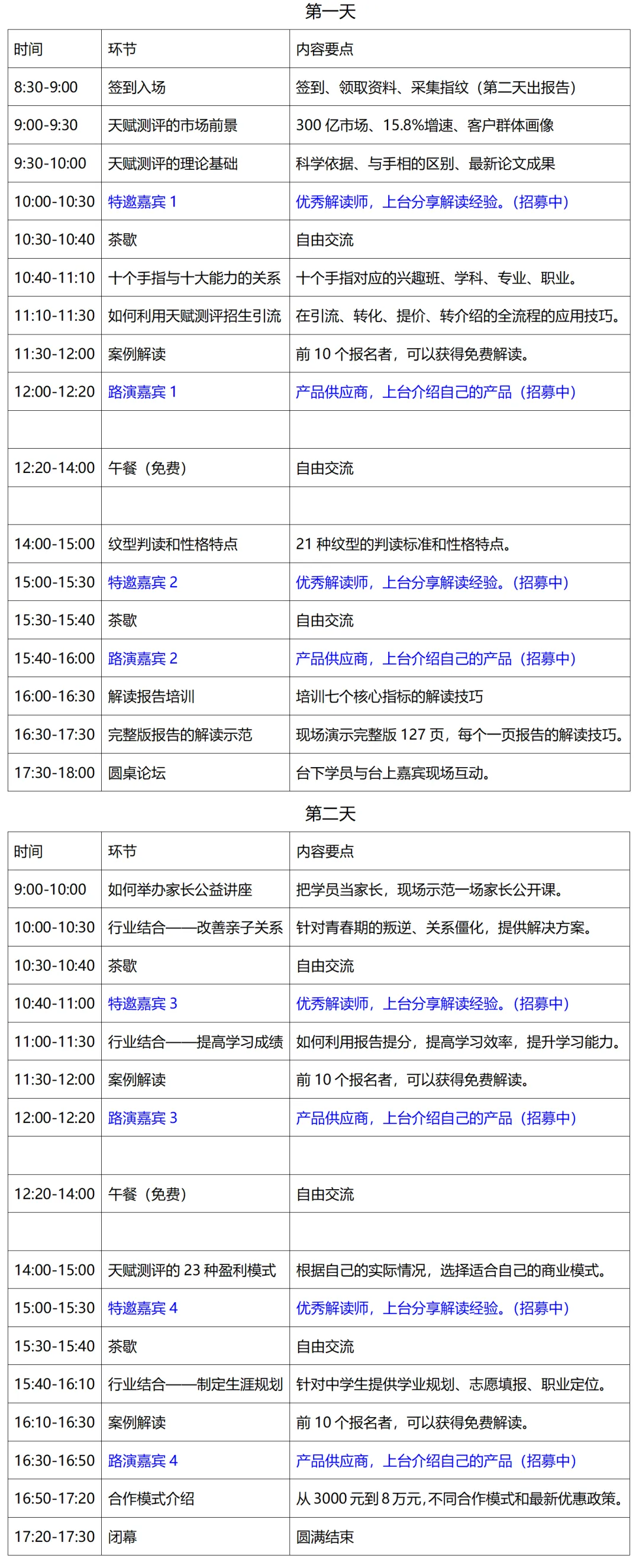 大会名称:天赋测评项目说明会 培训时间:2026年4月22日—23日 全程直播:现场培训+线上直播。 培训地址:山东○济南○金桥国际大厦C座4楼会议室 交通食宿:自理。免费提供2天的午餐。(可协助预定酒店) 大会费用:199元/人。 线上直播:99元/人,可以回放7天。 项目路演:500元/10分钟(每个行业仅限2家)