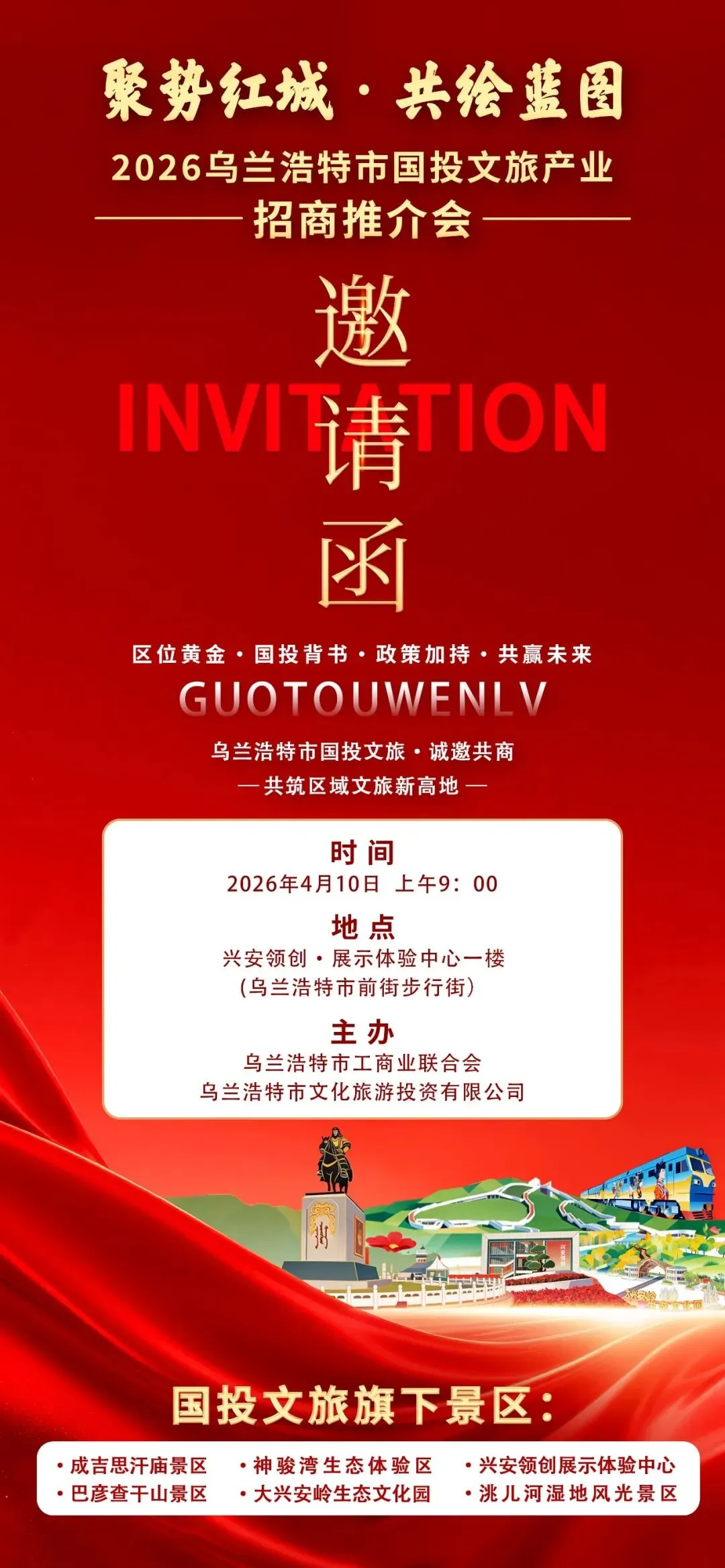 红城有底蕴,文旅有潜力,合作有前景。2026年4月10日9:00,兴安领创·展示体验中心,乌兰浩特市国投文旅,与您携手并肩,共筑红城文旅发展新未来!