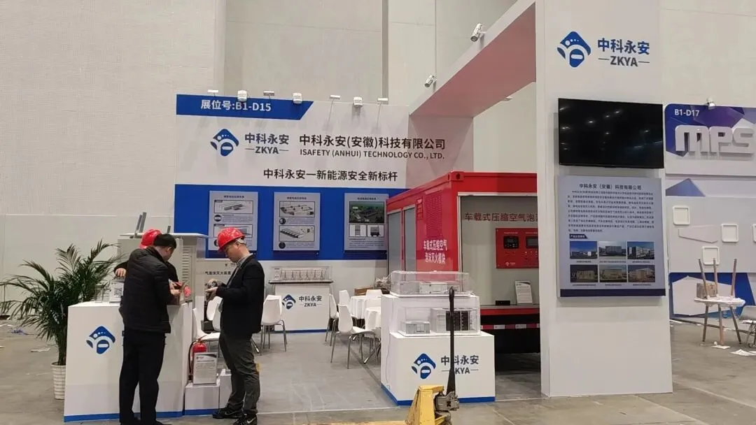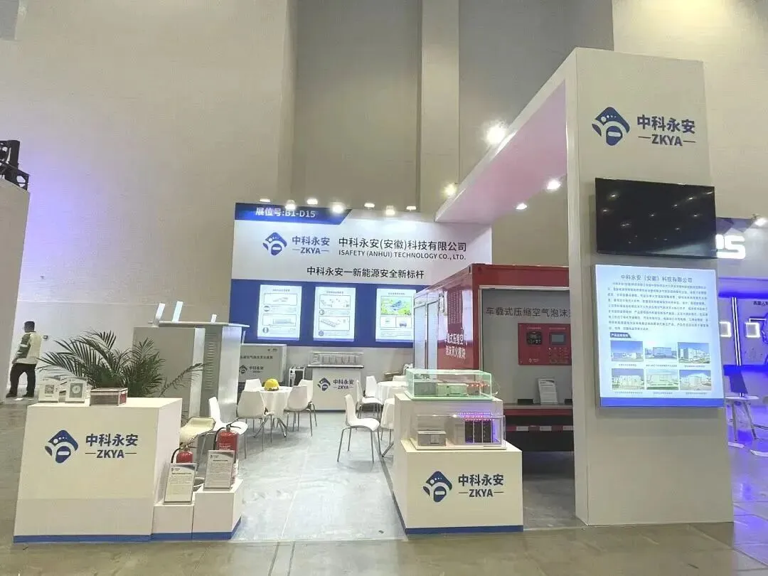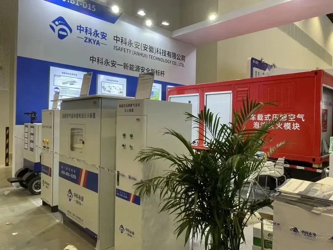 中科永安本次展会重点展示新一代固定式压缩空气泡沫灭火设备、车载式泡沫灭火模块,全系搭载自研锂电池专用泡沫灭火剂。