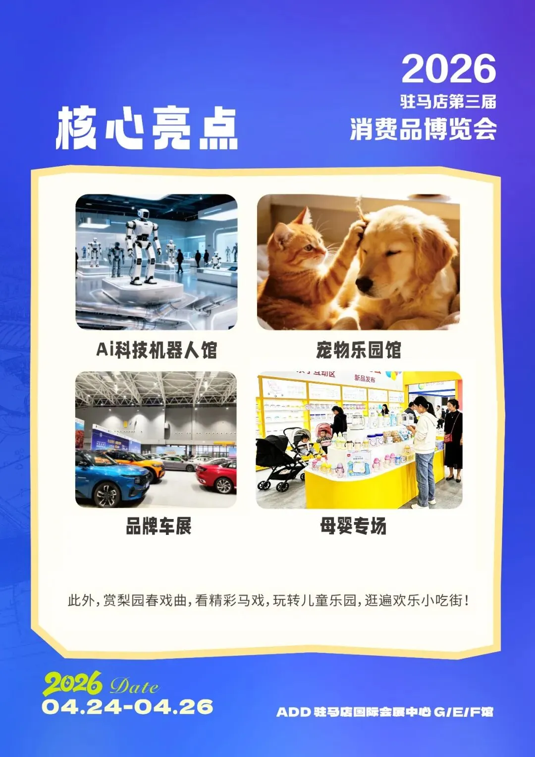 “好玩”互动区主打全龄沉浸式娱乐,萌宠专区与宠物用品区萌趣拉满,各类可爱萌宠轮番亮相,互动表演逗人开怀,是爱宠人士不可错过的打卡圣地;直播电商专区邀请网红达人现场带货,优质特色产品线上线下同步热销,打通消费新渠道。大型国际马戏表演震撼登场,惊险刺激的节目引爆全场;经典梨园春戏曲展演唱响天中,传承传统文化魅力;美食啤酒节同步火热开启,各地特色小吃、网红美食齐聚,烟火气十足,搭配趣味亲子活动,打造“吃、喝、玩、乐、购”一站式全场景消费体验。