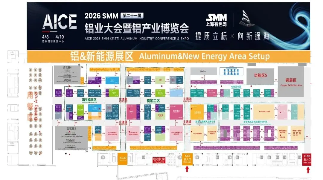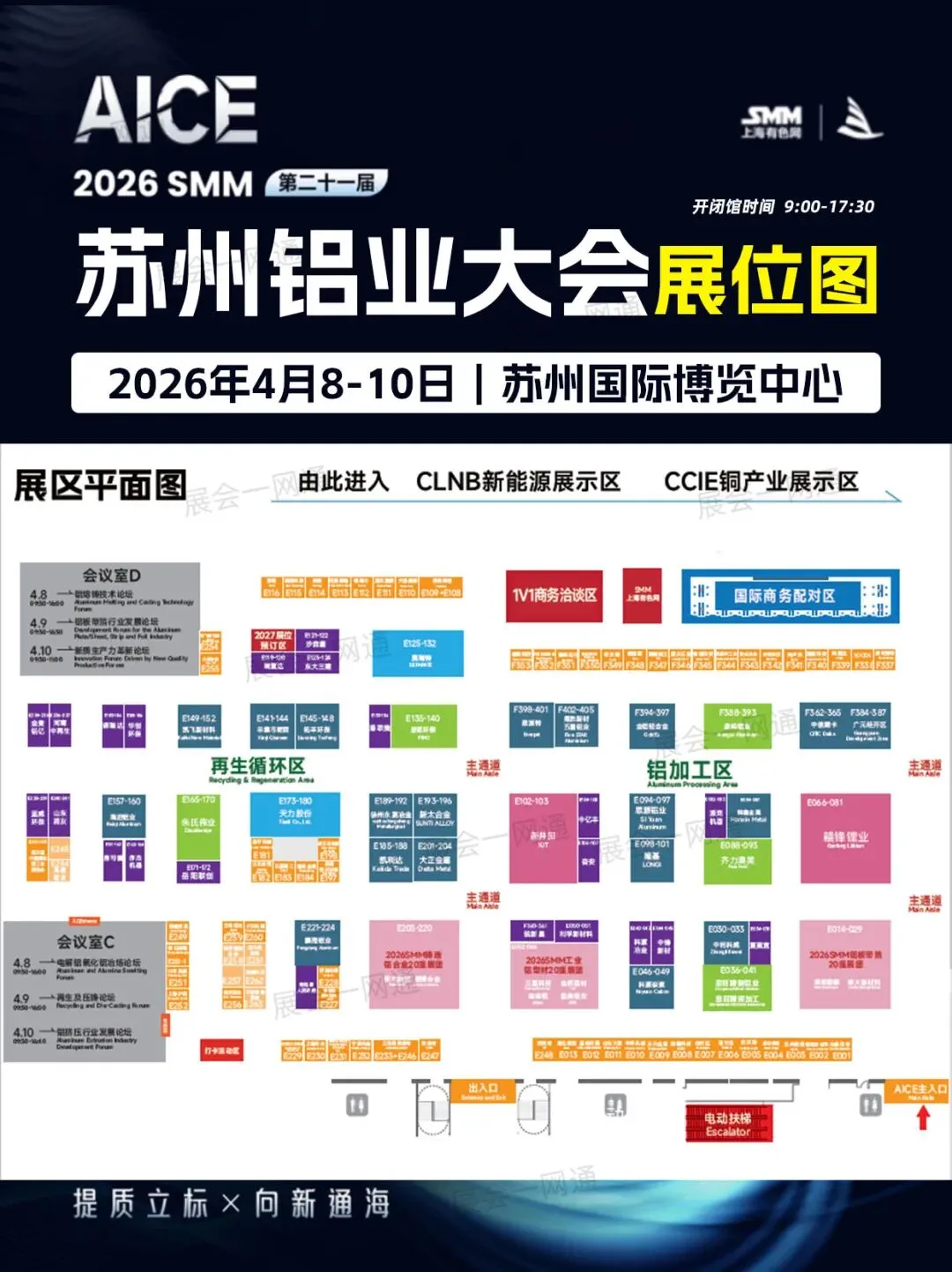 上海有色网信息科技股份有限公司(SMM)主办的AICE 2026 SMM(第二十一届)铝业大会暨铝产业博览会将在2026年4月8-10日在苏州国际博览中心盛大启幕!本届展会以“提质立标·向新通海”为主题,汇聚全球铝产业链及终端应用领域优质资源,集结数百家行业领军企业全方位展示铝产业全链条的创新成果与技术突破,构建铝业上下游协同发展的生态平台,推动产学研用深度融合,助力全球铝产业突破同质化竞争。同期举办:CLNB苏州新能源产业博览会、CCIE苏州铜业大会