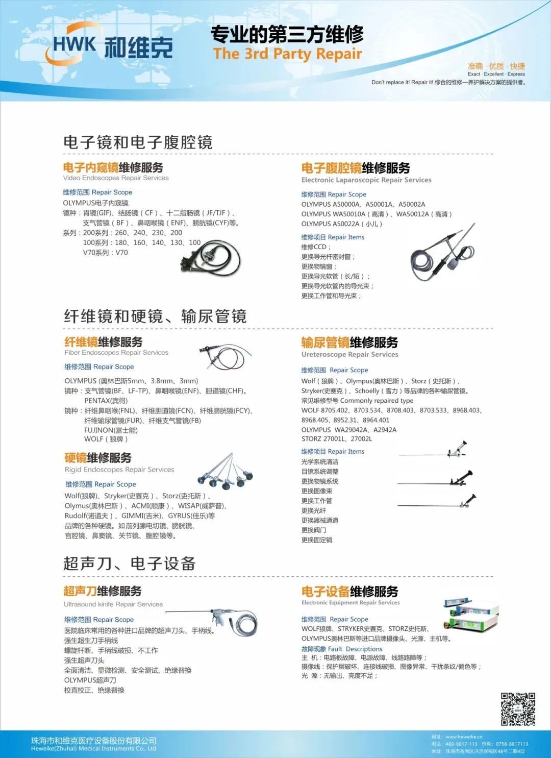 维修范围的覆盖:进口品牌,如OLYMPUS、FUJINON、PENTAX、Storz、Wolf、Stryker等;国产品牌,如优亿、迈德豪、视新、澳华、明象、因赛德思、宏济等。
