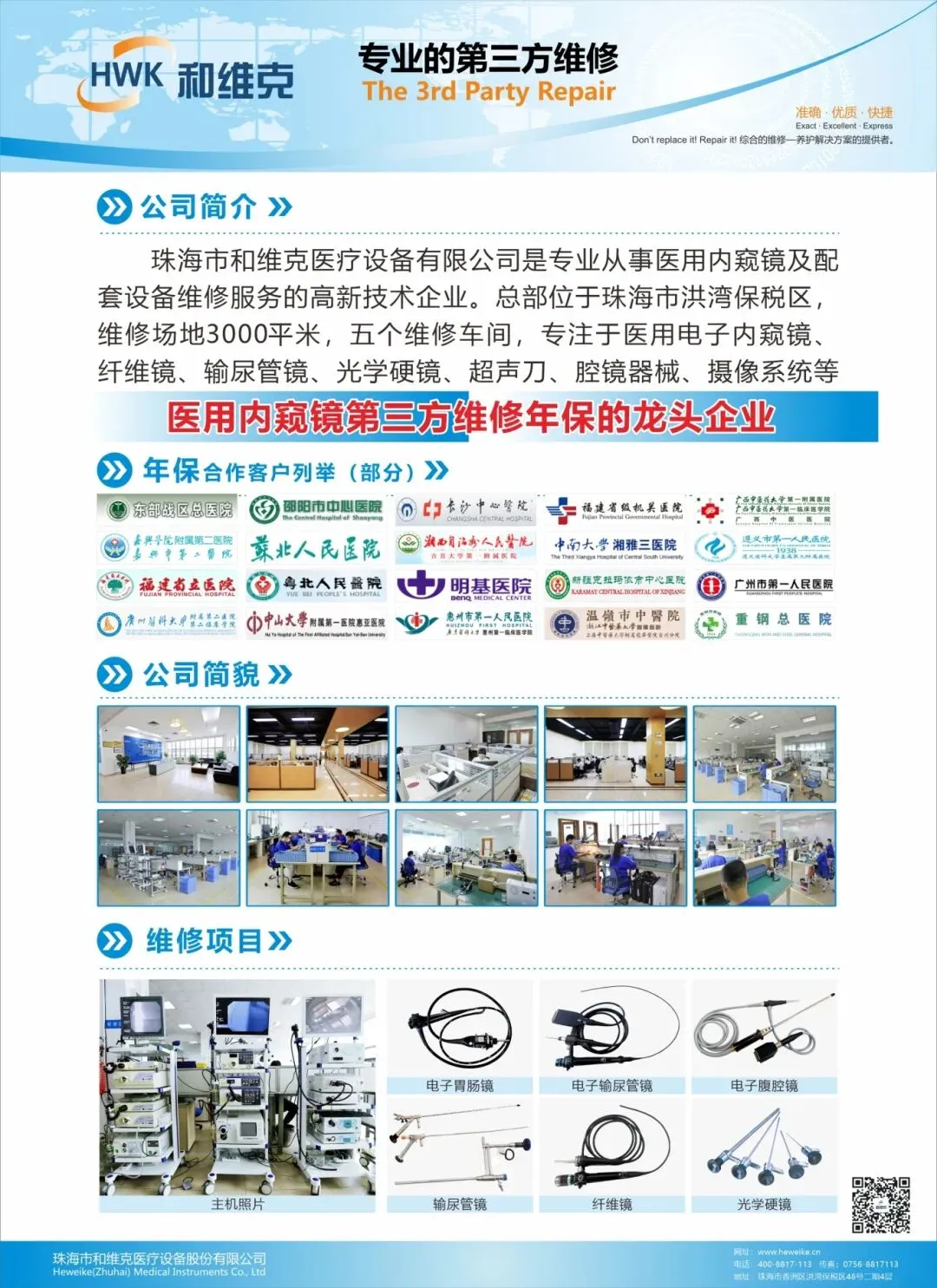 珠海市和维克医疗设备有限公司是专业从事医用内窥镜维修服务的高新技术企业,于2006年率先在国内开展内窥镜维修业务,距今已18年有余。总部位于珠海保税区,维修场地2000平方,五个维修车间,一个生产车间,专注于医用电子内窥镜、纤维镜、光学硬镜、输尿管镜、超声刀、腔镜器械、摄像系统等维修领域。