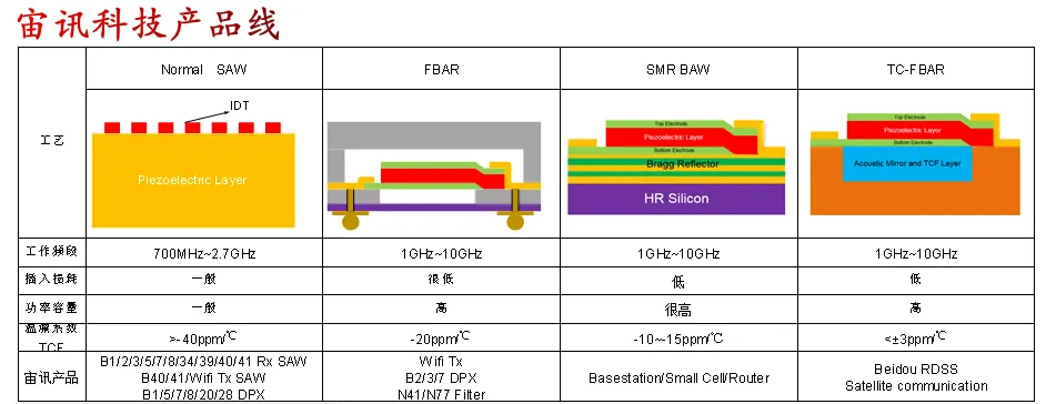 公司核心产品包括声表面波滤波器(SAW)和体声波滤波器(BAW)。公司产品主要应用于智能手机、物联网、平板电脑、基站、卫星定位、导航设备等多个行业。宙讯科技高性能零温漂TC-FBAR滤波器和双工器的量产,进一步夯实了宙讯科技IDM策略,有效提升企业的整体竞争力,有利于更好地整合滤波器设计研发与工艺技术平台的一体化。未来,宙讯科技将把握住“芯”机遇,不断丰富产品群,加大力度推动企业迈上新的台阶,持续为客户提供更优质和值得期待的产品和服务!