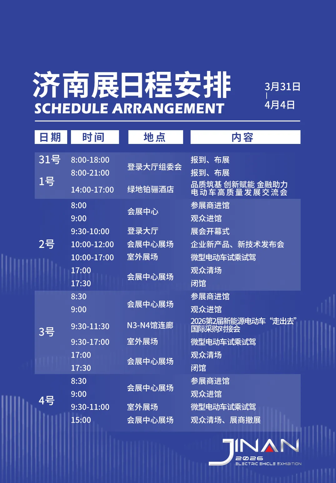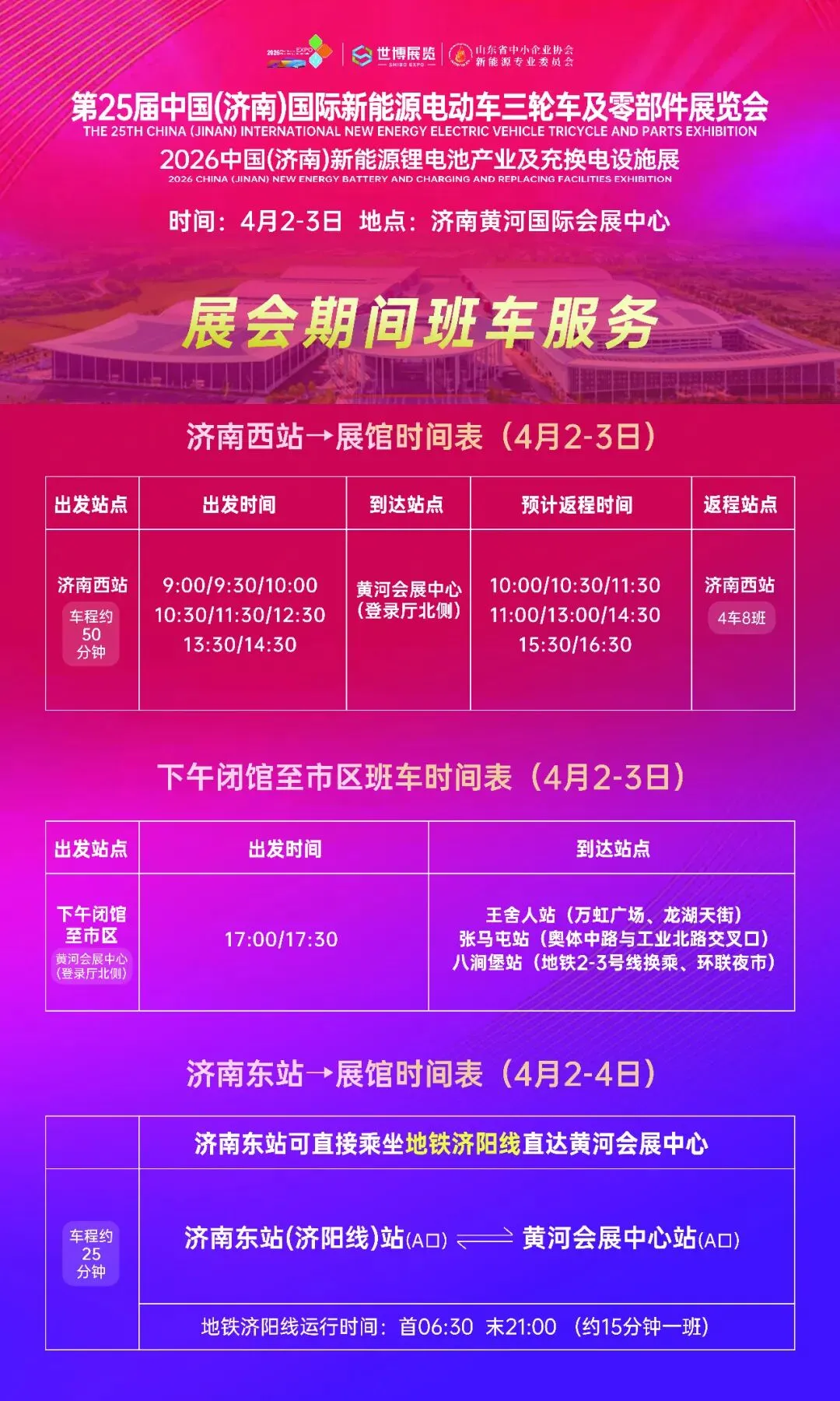 2026第25届中国(济南)新能源电动车及零部件展览会、中国(济南)新能源锂电池产业及充换电设施展将于2026年4月2-4日在济南黄河国际会展中心举办。为方便大家观展,在展会倒计时之际,组委会准备了此份观展指南,以供参考!