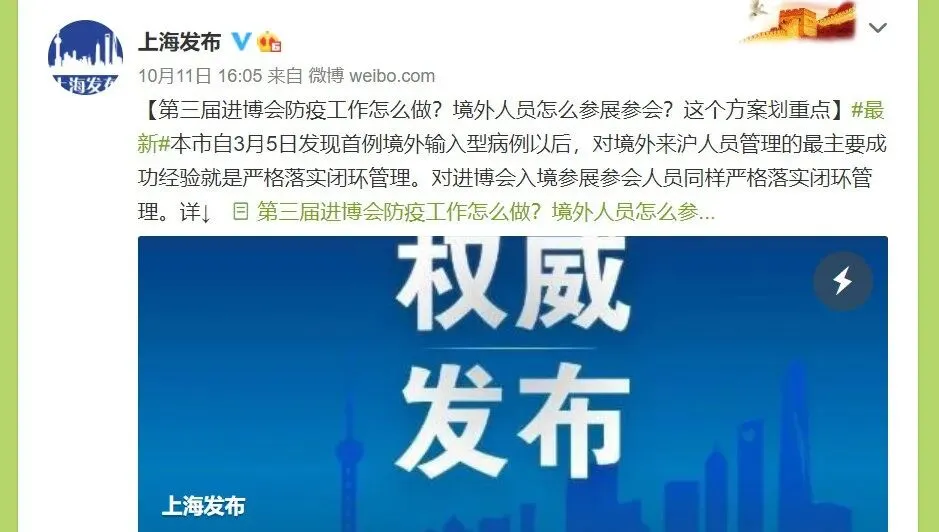 据上海市政府新闻办公室官微发布:上海自3月5日发现首例境外输入型病例以后,对境外来沪人员管理的最主要成功经验就是严格落实闭环管理。对进博会入境参展参会人员同样严格落实闭环管理。