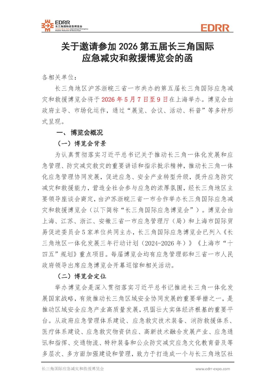 转发长三角国际应急减灾和救援博览会组委会秘书处关于《邀请参加2026 第五届长三角国际应急减灾和救援的函》