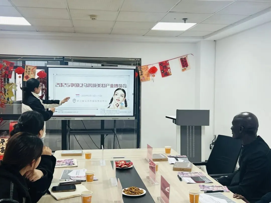 2026中国义乌跨境美妆产业博览会组委会向代表团隆重推介了本次展会,并发出诚挚邀约,邀请其携本土优质美妆原料亮相展会,共享中国跨境美妆市场红利。