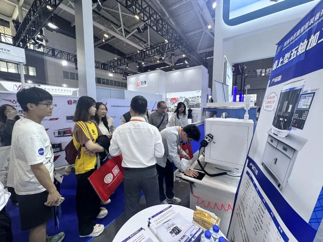 当天,来自广东机电职业技术学院先进制造技术学院、河源职业技术学院的师生们专程到访参观。现场,机器正在进行加工演示,师生们围在设备前认真观看五轴联动的运行轨迹,不时与现场技术人员交流技术细节。