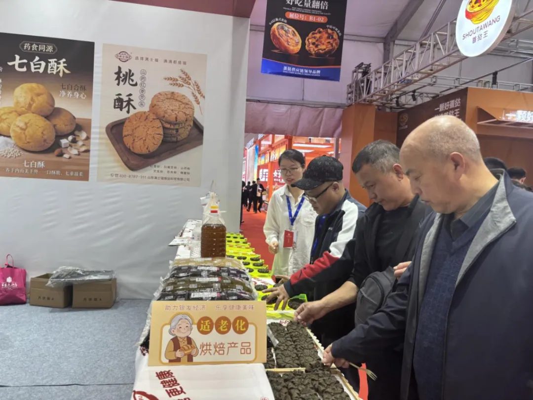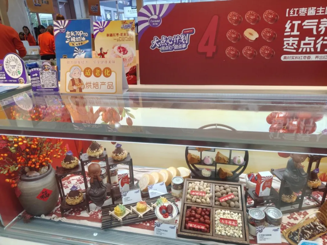 走进展区,适老化产品区域成为亮点聚焦区。以“红气养人,枣点行动” 为主题的红枣系列产品备受青睐,红枣花束蛋糕、红枣蛋挞、红枣酸奶等产品,兼顾口感与营养,香甜适中且易于消化,赢得老年朋友连连称赞。同时,“五黑”“五红”“八珍”“七白” 等药食同源系列糕点,以及无蔗糖黑麦蛋糕、低糖山药核桃糕点等,精准适配控糖、养生等老年消费需求,成为现场咨询、选购的热门产品,生动诠释了产业升级与为老服务的深度融合。