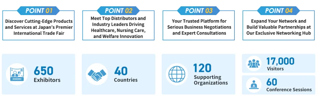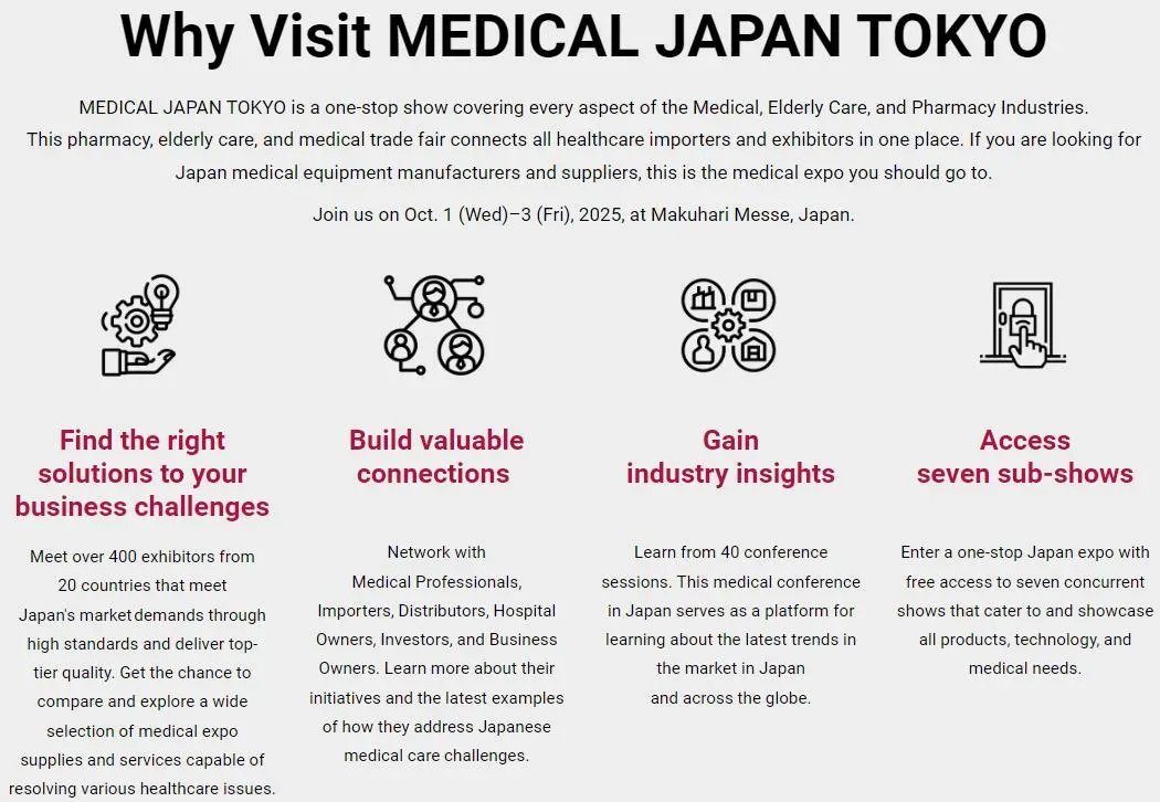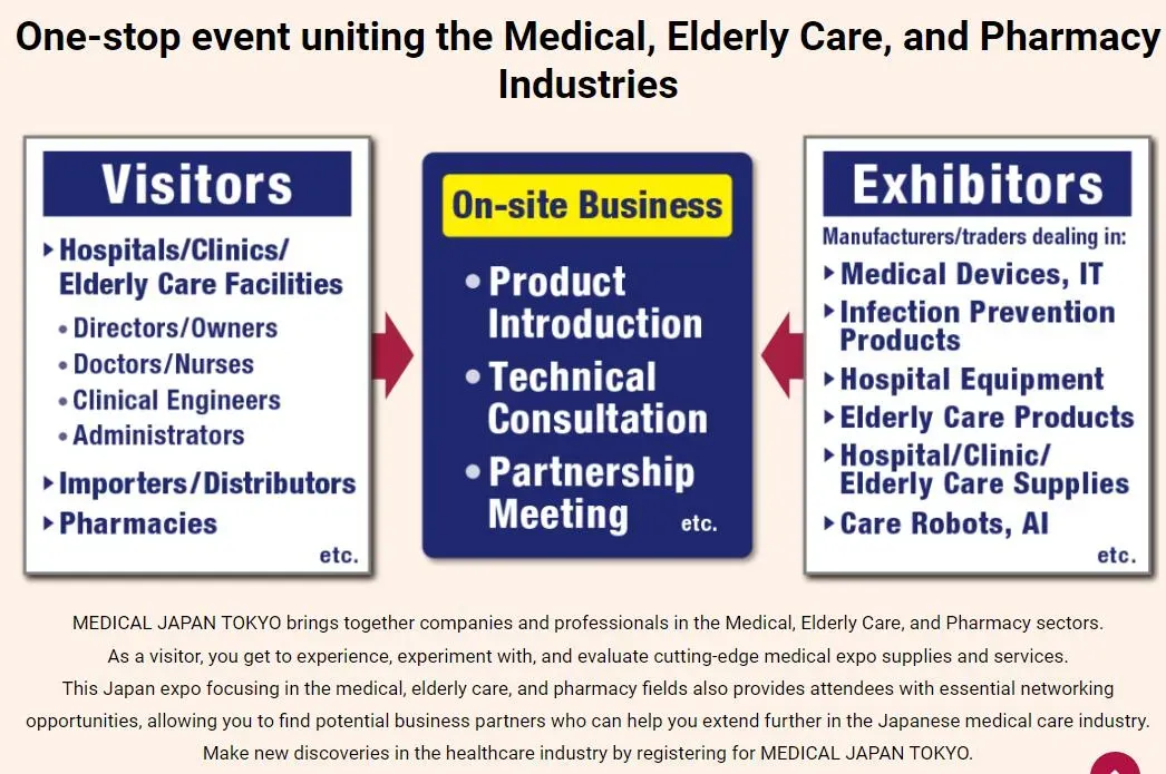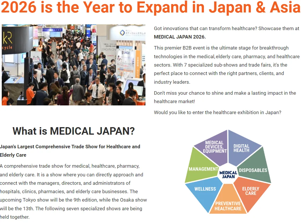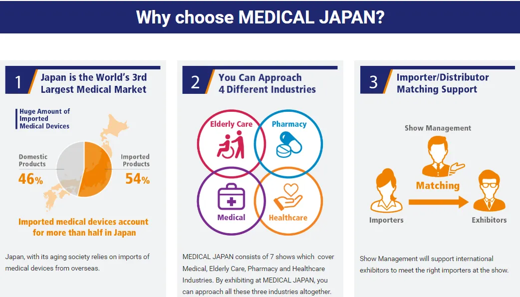 日本东京国际医疗展是日本最大的医疗交易展。每年分2地举办,春季在大阪,秋季在东京。日本作为全球第三大医疗市场,也是全球平均寿命最长的国家,全球老龄人口比例最高的国家,日渐增多的高龄化人口对于医疗设施和器械等的高度需求,推动着日本医疗市场持续稳定的发展。日本需要持续扩张医疗资源,如新建医院和养老院等。