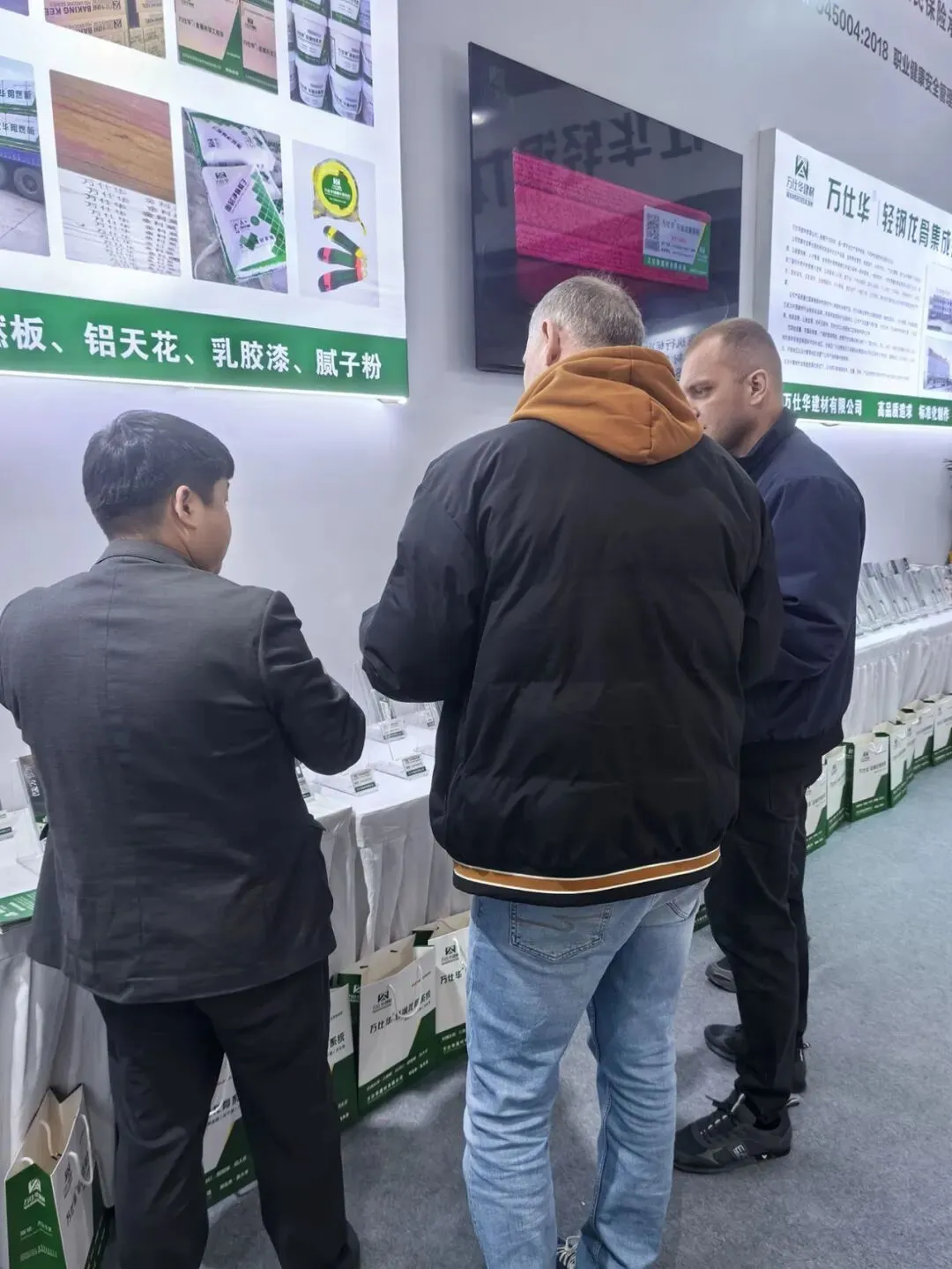 本次北京国际家居产业博览会,聚焦家居产业创新发展与品质升级,吸引了海量专业采购商、设计师、家装从业者及行业媒体到场。万仕华建材精心打造特色展区,以简洁大气的布置、清晰的产品展示体系,全方位呈现品牌在建材领域的深耕成果,将产品性能、工艺优势与应用场景直观展现给每一位参观者。