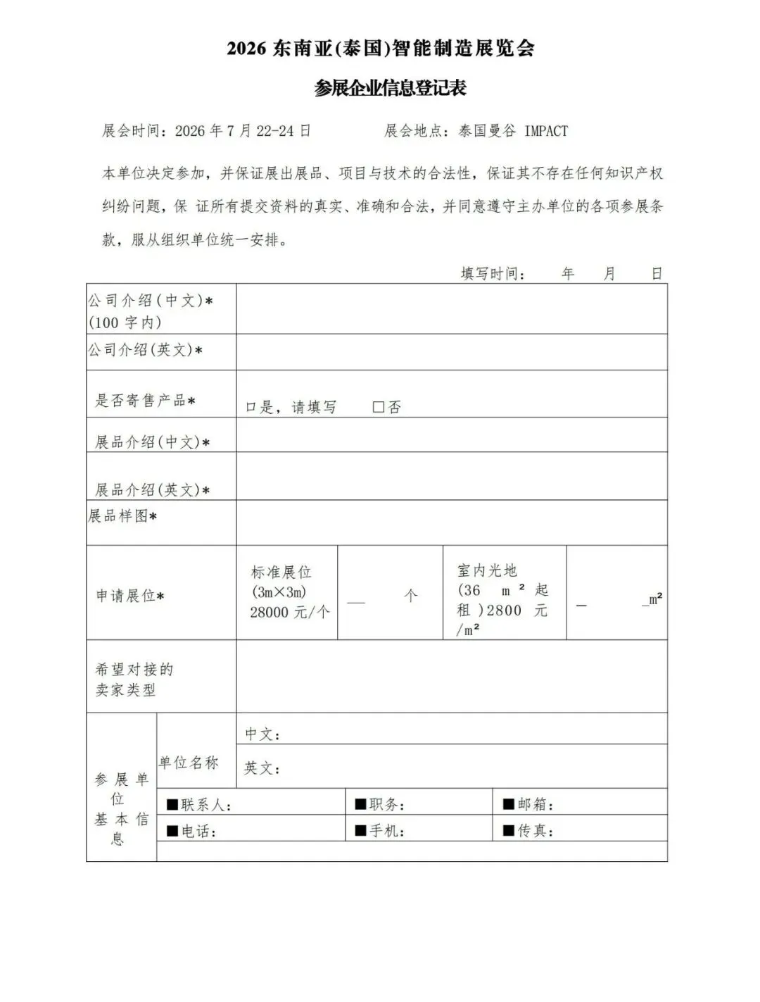 2026东南亚(泰国)智能制造展览会参展企业信息登记表