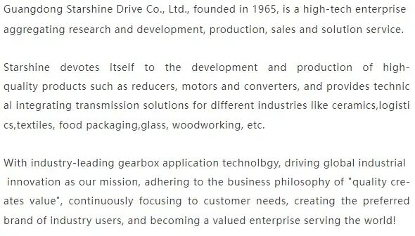 公司精心致力于减速机+电动机+变频器+控制器+智慧系统等高质量产品的开发和生产,为陶瓷、物流、纺织、粮油,食品,包装、玻璃、木工、高压隔离开关、塑料机械等行业提供高效整体传动方案。