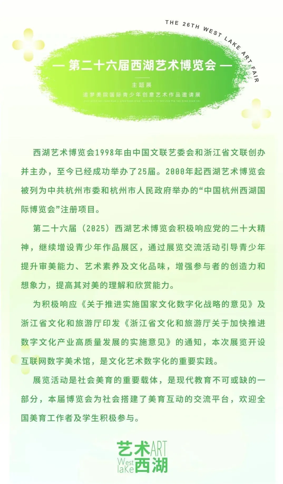 【官方发布】第二十六届西湖艺术博览会主题展:追梦美院——国际青少年创意艺术作品邀请展全国征稿!