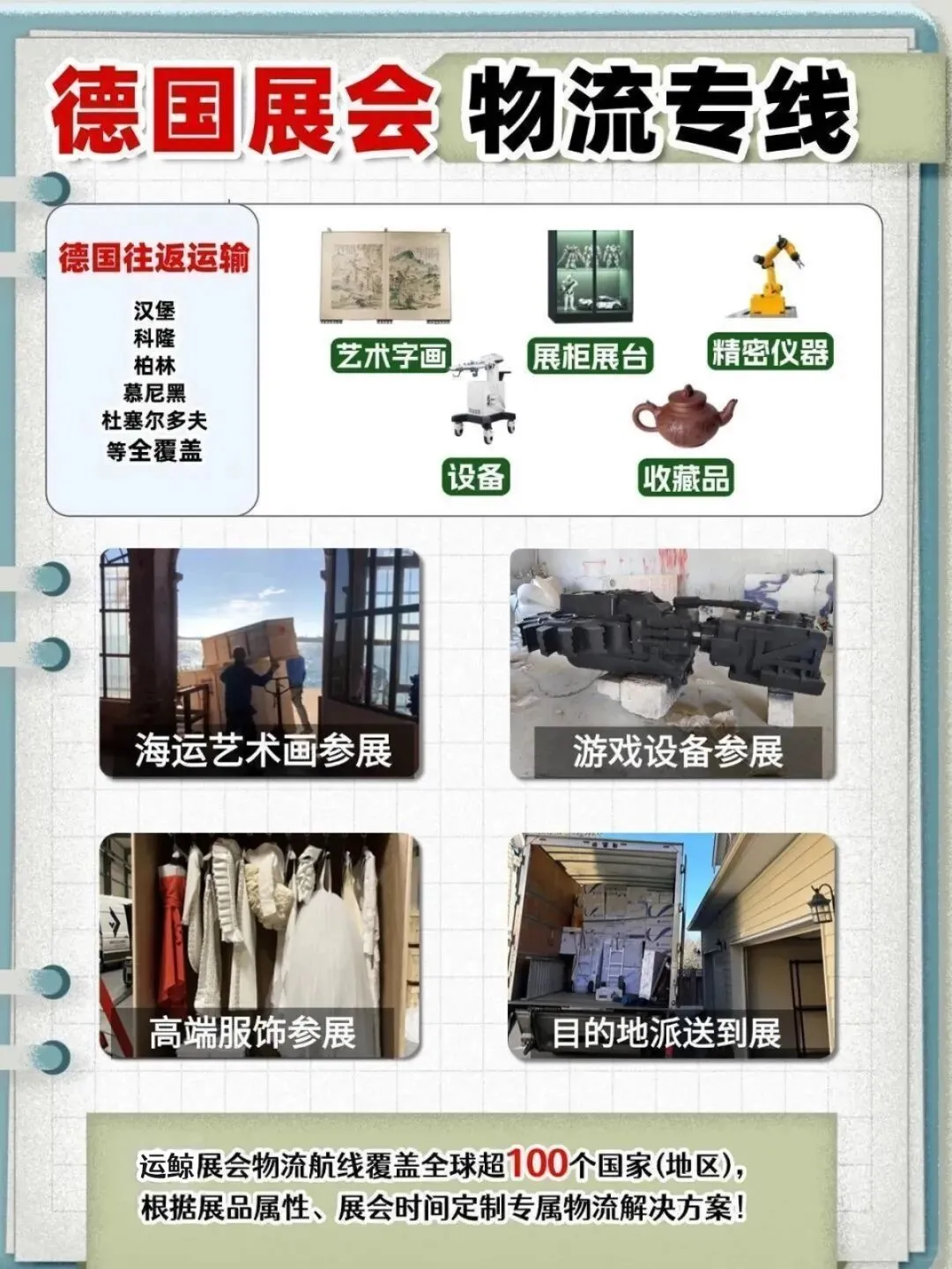 不管你是去汉堡、科隆、柏林、慕尼黑还是杜塞尔多夫参展,我们的往返运输线路直接打通,不用再转来转去折腾展品,省心到离谱!从国内打包到德国派送到展,全程不用你多费心,一站式搞定所有物流环节~