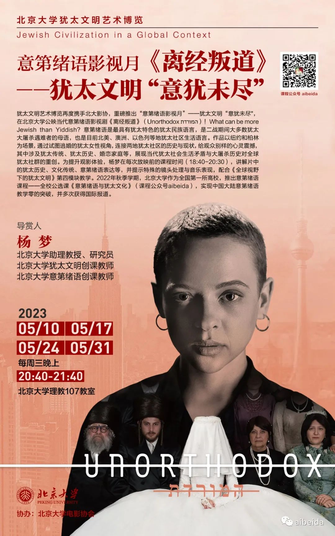 犹太文明艺术博览再度携手北大影协,重磅推出“意第绪语影视月”——犹太文明“意犹未尽”,在北京大学公映当代意第绪语影视剧《离经叛道》(Unorthodox המורדת )!