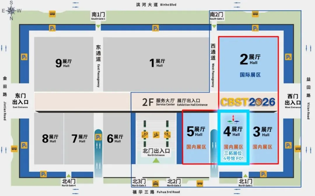 本届CBST 2026在深圳会展中心 2/3/4/5号馆 举办:2馆为国际展区,3/4馆为国内展区。