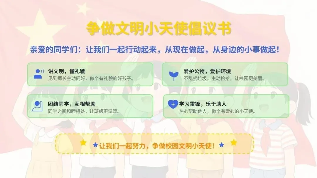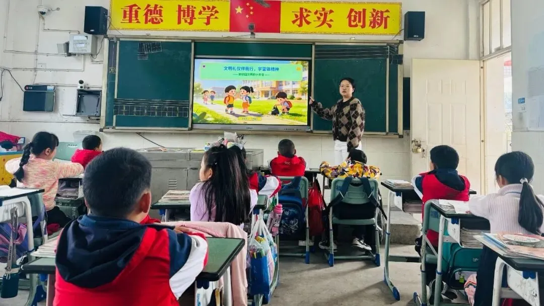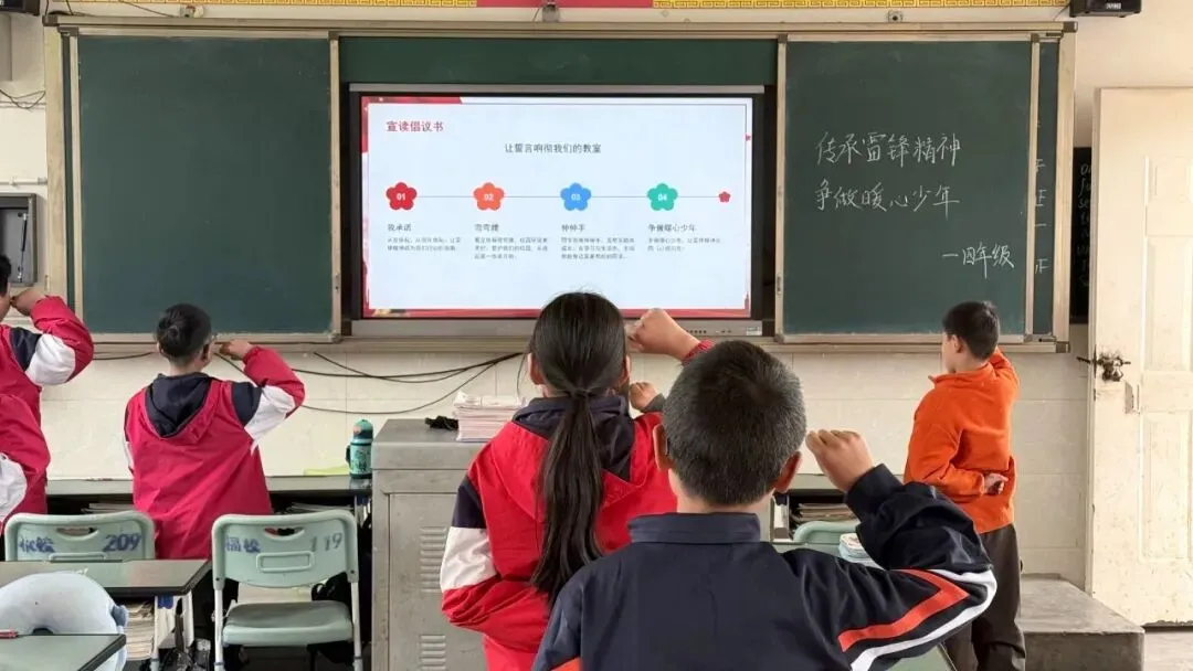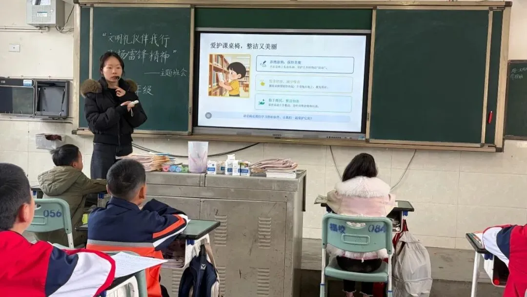 在一至三年级“文明礼仪伴我行,雷锋精神润童心”主题班会中,孩子们从动画中习得文明用语,于游戏间守护校园公物,在雷锋故事里点燃助人热情。情景演练中,一双双稚嫩的小手主动伸出,搀扶起摔倒的“伙伴”,温暖满堂。庄严宣誓后,孩子们郑重接过“文明行为小奖章”,将雷锋精神的种子,悄然播撒在春天的校园里。