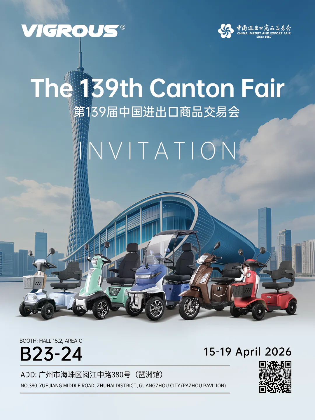 Global buyers, join the grand fair ? The 139th China Import and Export Fair (Canton Fair) is grandly opened. VIGROUS E-Scooter brings a variety of certified models with EU EEC & CE certifications covering urban commuting, medical rehabilitation and elderly mobility, perfectly matching overseas market standards. We sincerely invite global buyers and industry partners to visit our booth, inspect products, discuss cooperation and win-win future!