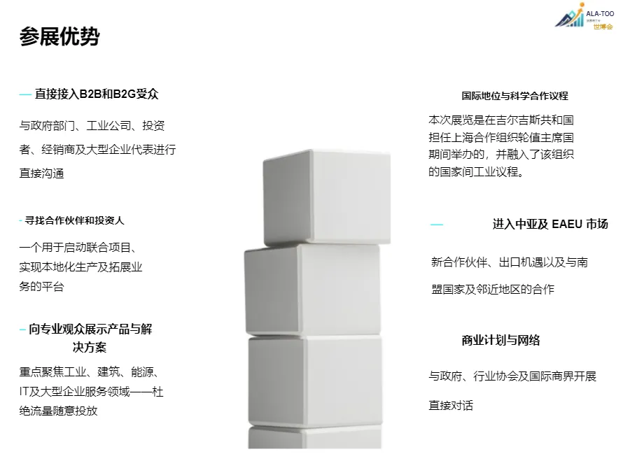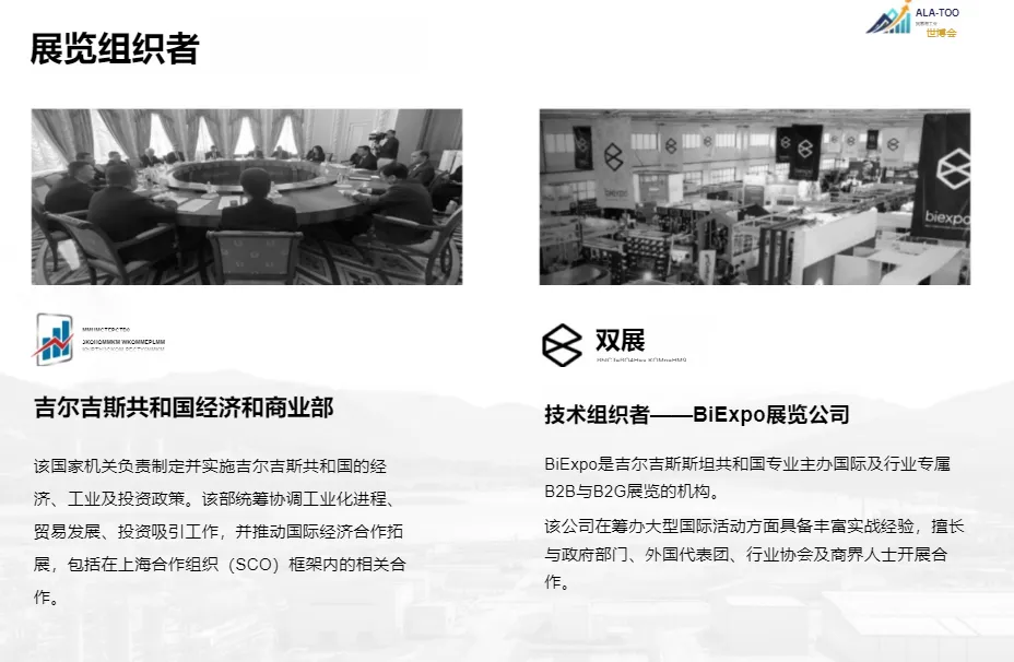 作为吉尔吉斯共和国经济和商务部牵头主办的专业平台,阿拉套贸易工业博览会旨在汇聚来自上合组织成员国及伙伴国家的工业企业、贸易公司、投资者和政府机构,推动区域工业合作与经济联动。