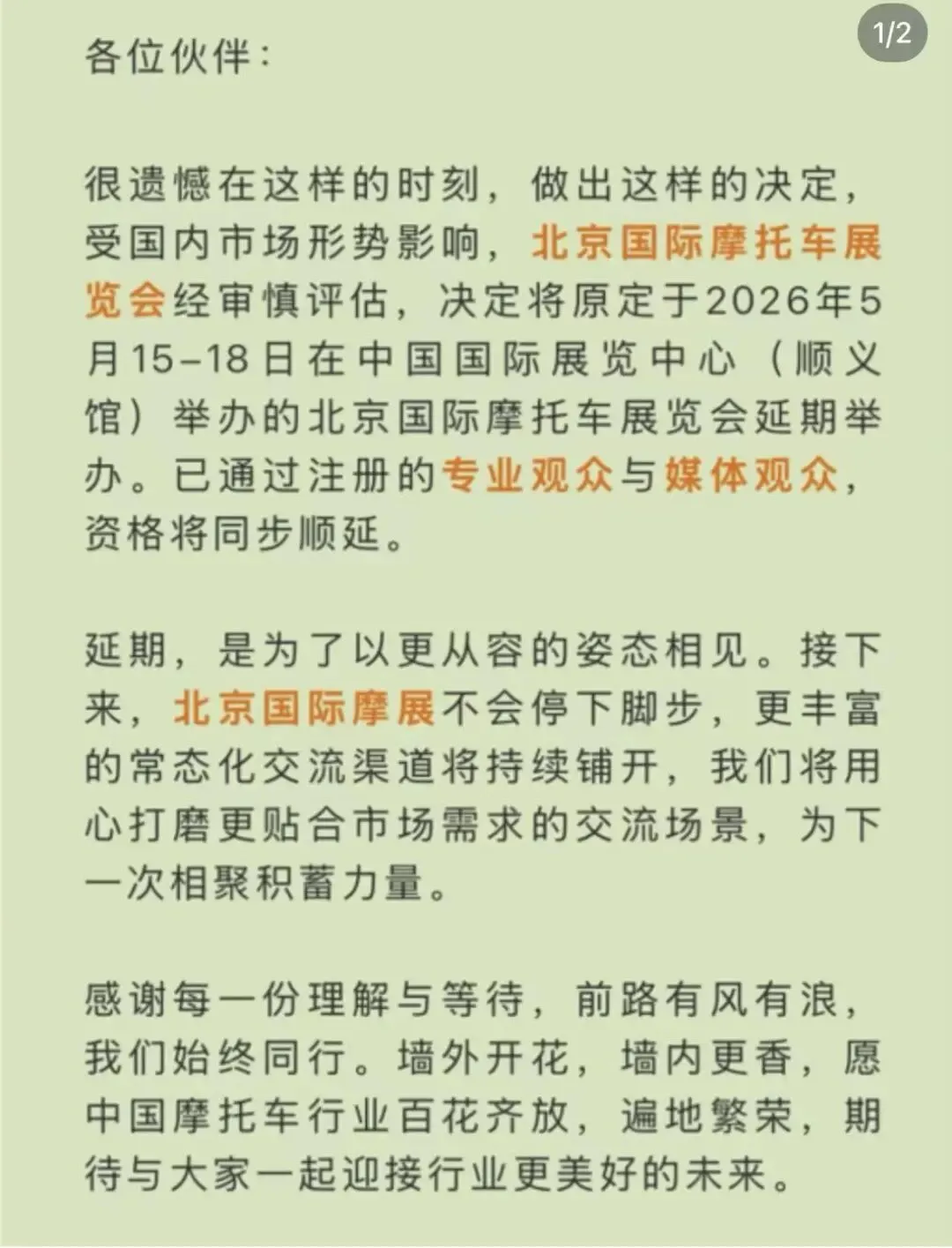 突发!2026北京国际摩托车展览会正式宣布延期