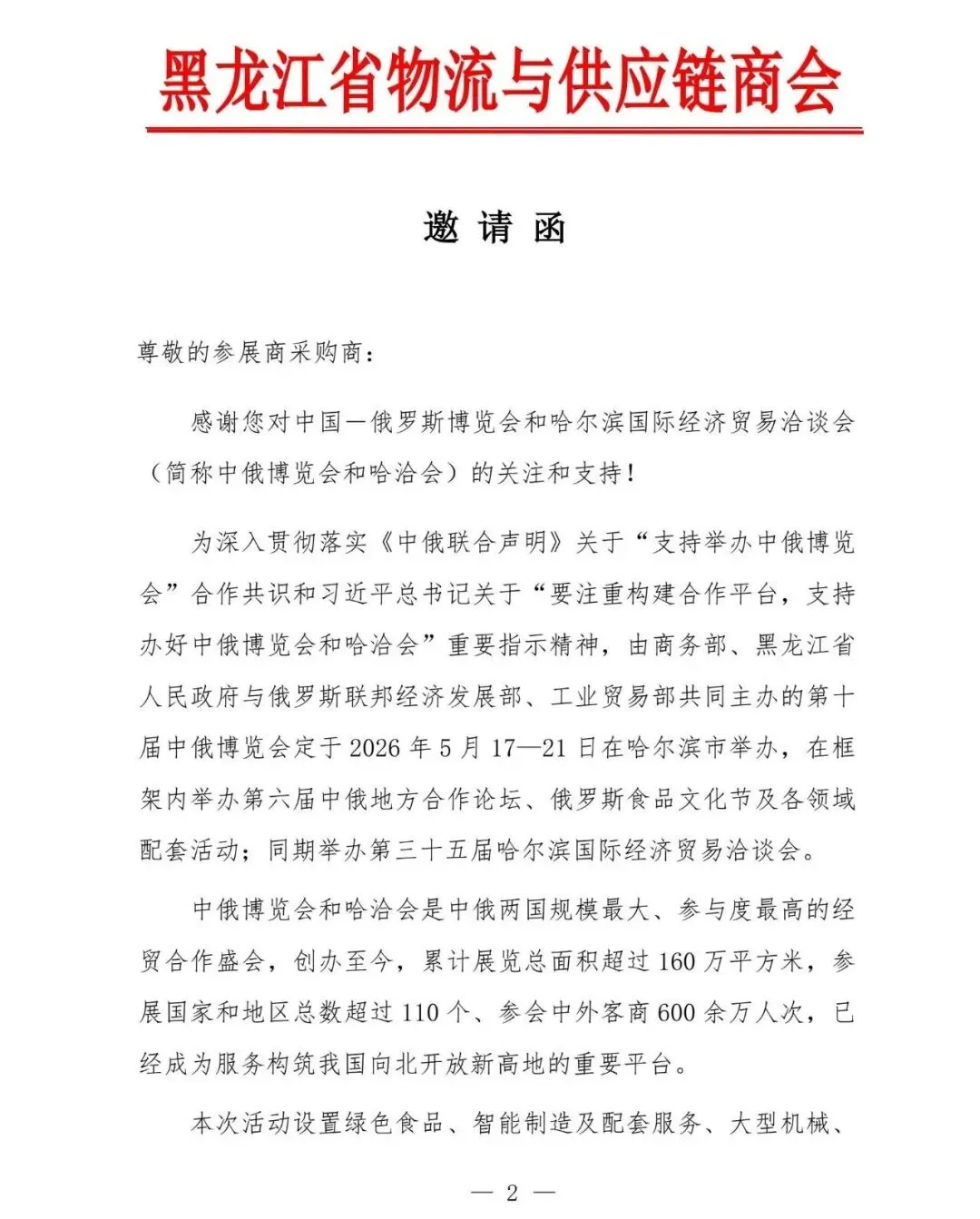 邀请函 | 关于参加第十届中俄博览会和第三十五届哈洽会系列活动的邀请函