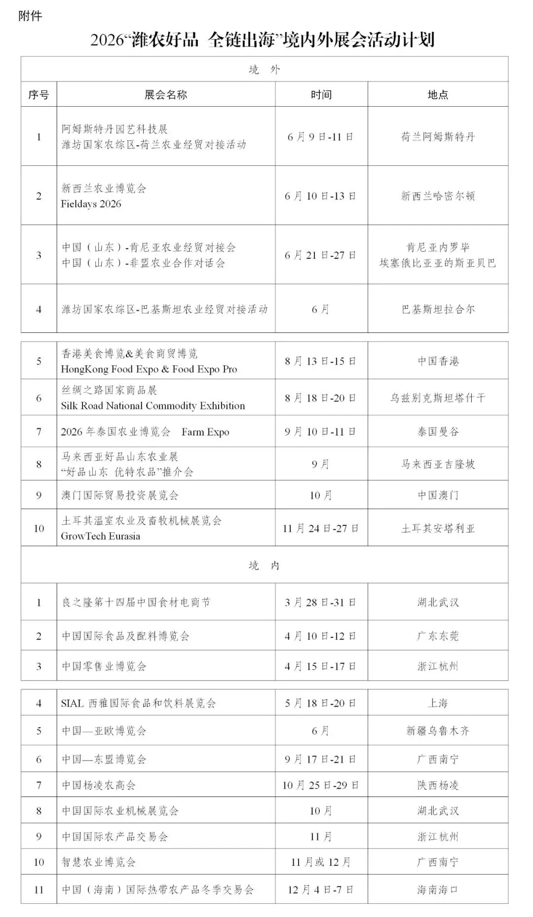 为加快提升“潍农好品”品牌知名度,推动我市农业全产业链拓展国内外市场,潍坊国家农综区推进办、市农业农村局联合组织开展2026年“潍农好品 全链出海”境内外展会及经贸对接活动。全年计划组织24场次活动,其中境外10场次,涵盖荷兰、新西兰、肯尼亚、泰国、马来西亚等国家;境内11场次,覆盖武汉、东莞、杭州、上海、南宁等城市;另设区域专项经贸对接活动3场次。