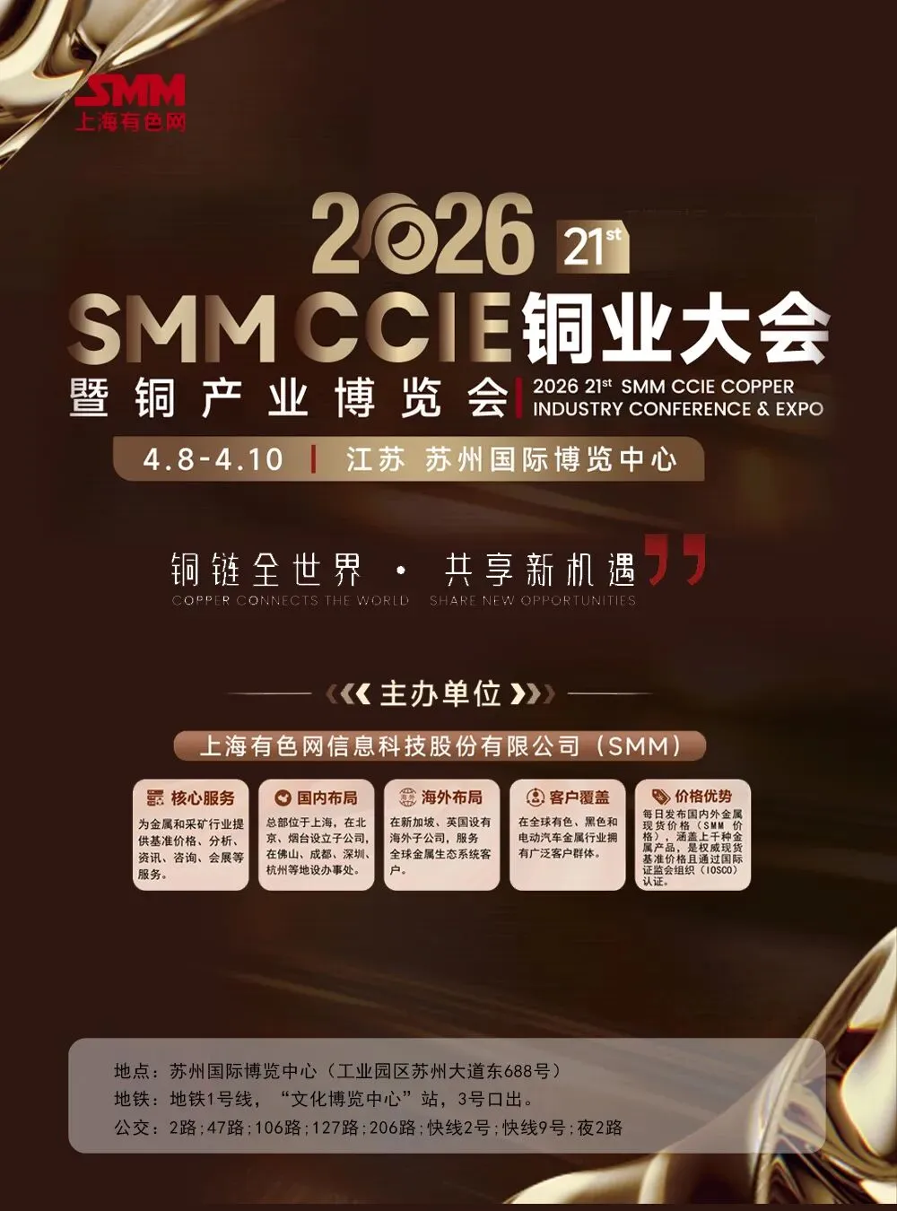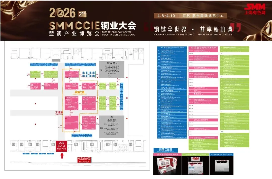 上海有色网信息科技股份有限公司(SMM)主办的CCIE 2026 SMM(第二十一届)铜业大会暨铜产业博览会将在2026年4月8-10日在苏州国际博览中心盛大启幕!