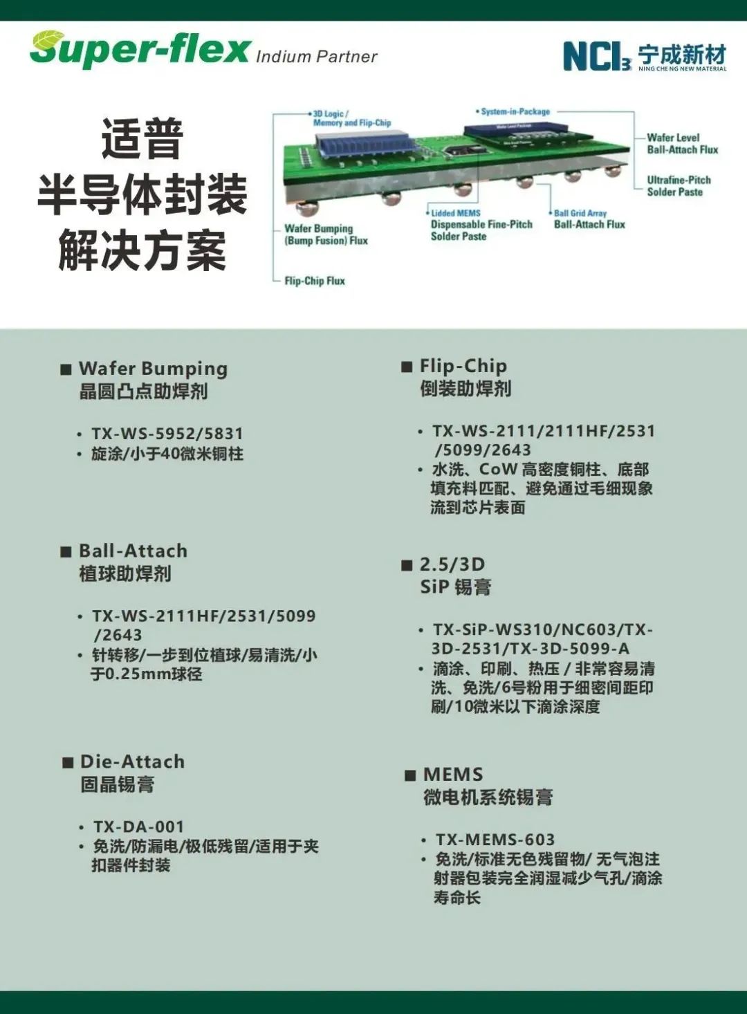 针对半导体封装,适普提供了包括晶圆凸点助焊剂、植球助焊剂、固晶锡膏在内的多种解决方案。