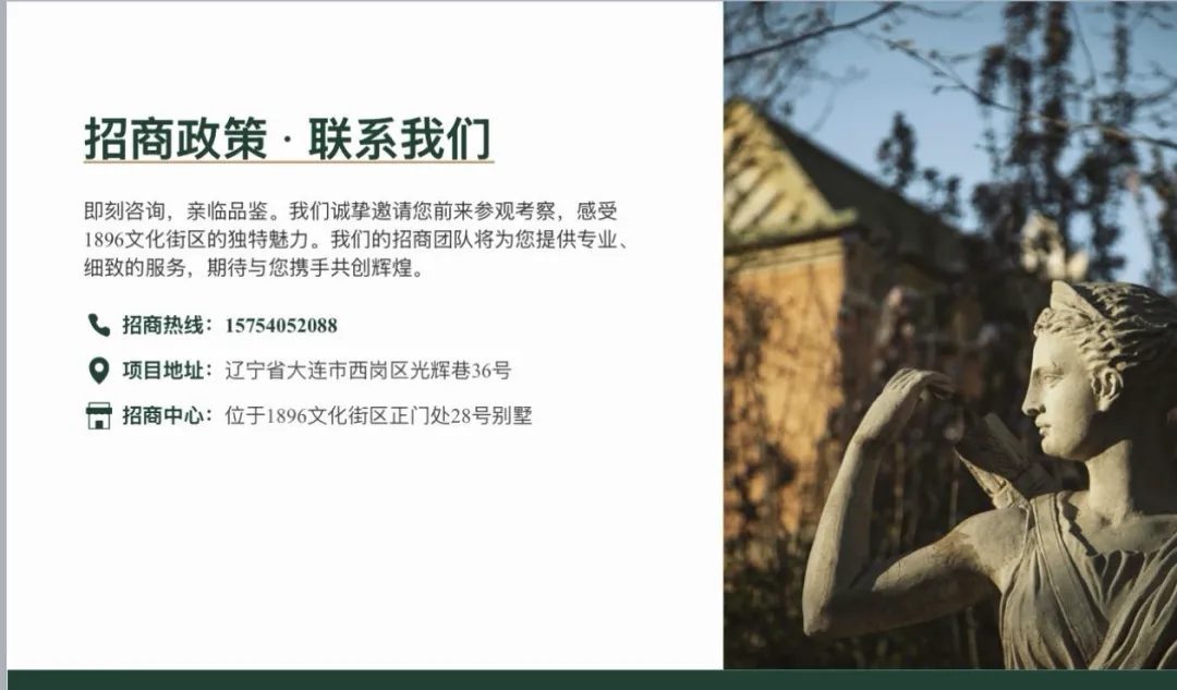 小链接:大连1896文化园区坐落于西岗区光辉巷36号,由28栋省级保护建筑与园林共同构筑。这片建设于19世纪末的百年建筑群落,是大连市宝贵的历史文化资源。如今这片百年胜地迎来全新蜕变,将着力打造复合型文化街区,以深厚艺术底蕴与独特文化气质为核心,集文化展示、潮流体验、特色消费于一体,让百年历史肌理与现代城市活力交融共生,焕新城市文化生活,重塑城市文化新地标。