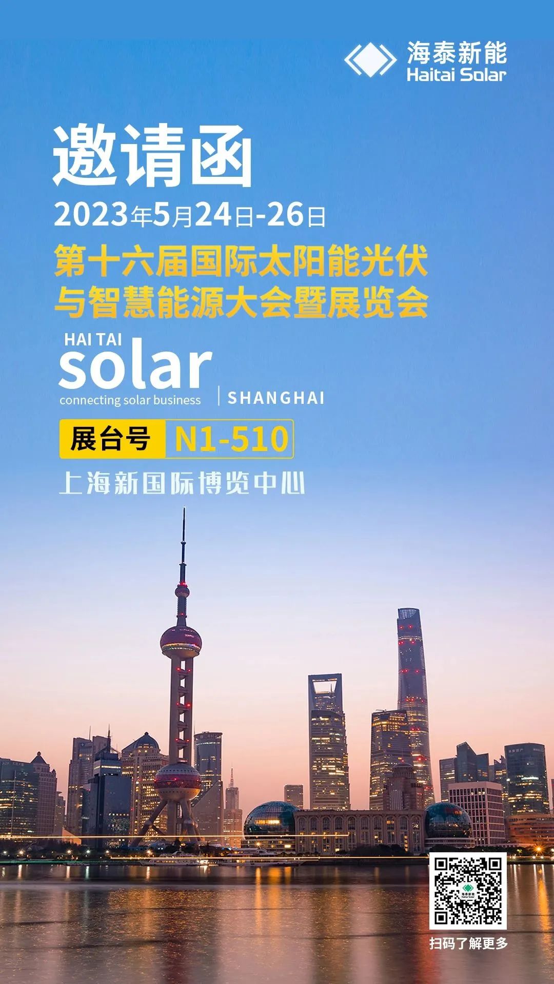 5月24日-26日,全球最具专业化、国际化、规模化的光伏盛会——第十六届(2023)国际太阳能光伏与智慧能源(上海)大会暨展览会将在上海新国际博览中心隆重举行。届时,海泰新能将携多款新能源产品隆重亮相N1-510展位,期待与您相约!