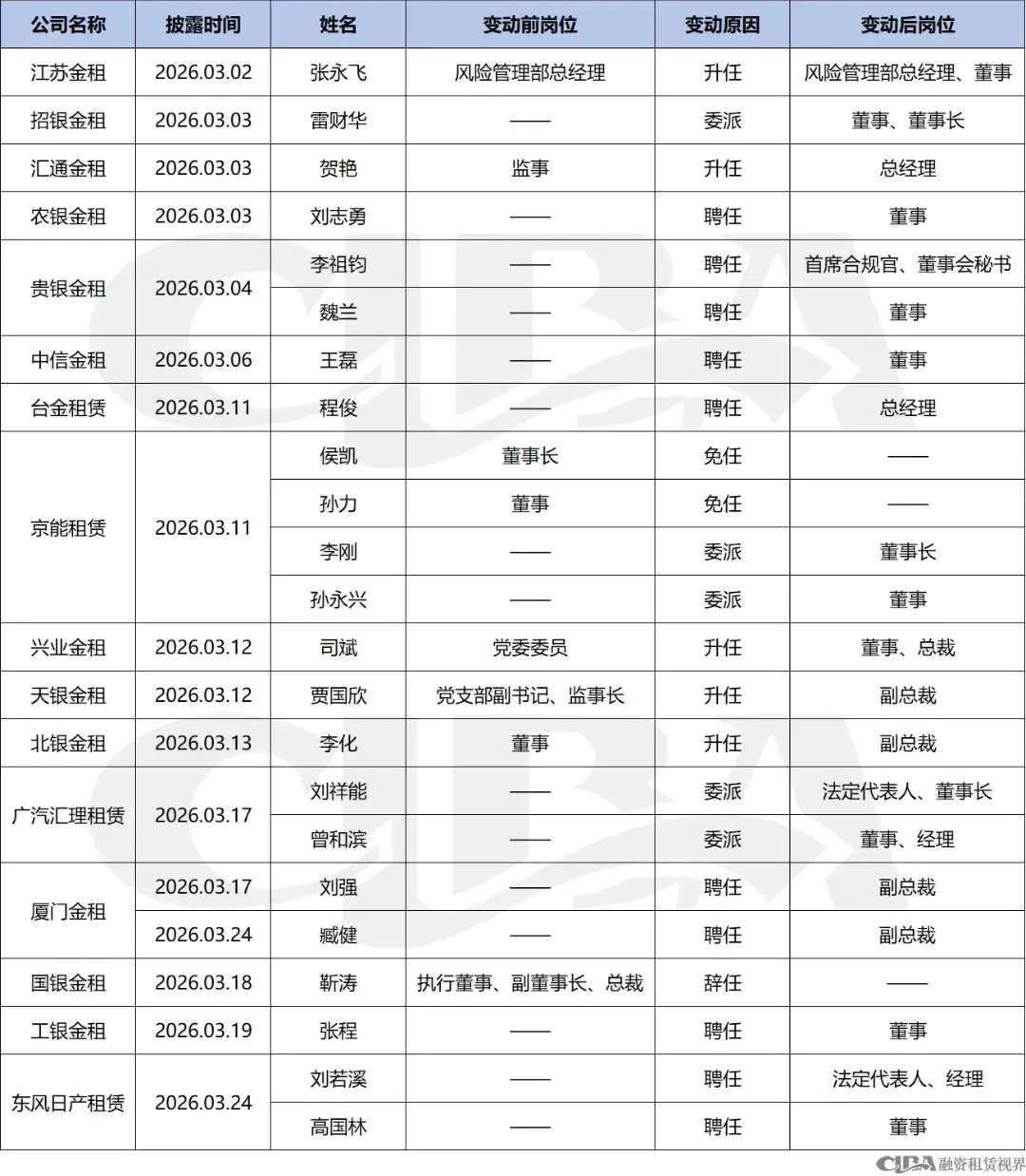 据不完全统计,2026年3月,我国融资租赁行业共计发生23项管理层职务调整,涉及16家融资租赁企业。其中,12家金融租赁公司共计发生14项人事变动,4家融资租赁公司共计发生9项人事变动。