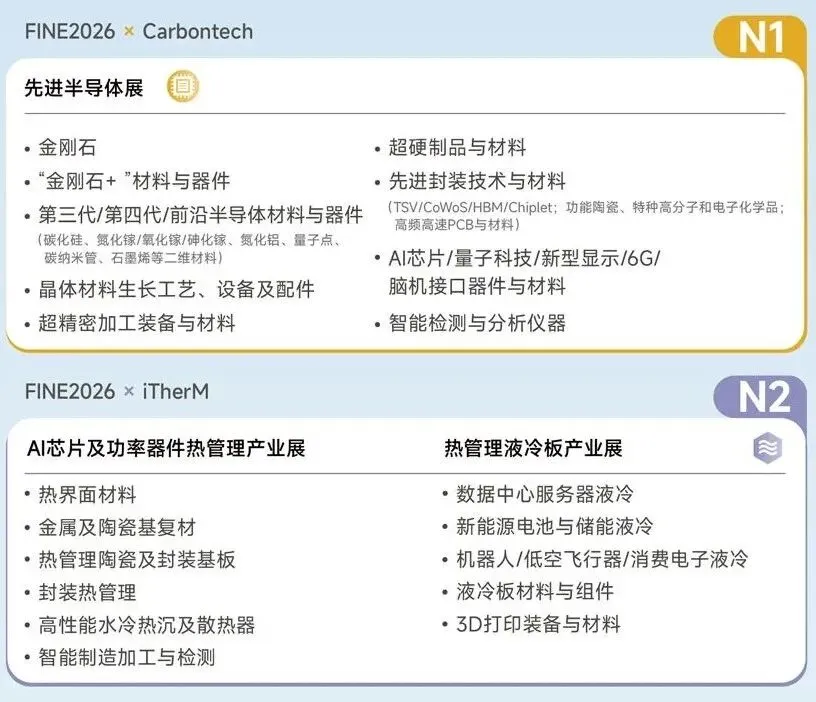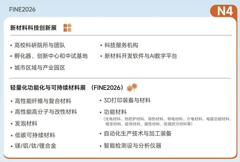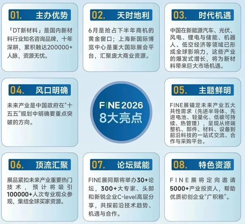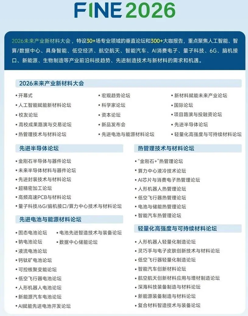 FINE2026,以50,000平展区与超过300场战略与前沿科技报告,全景呈现应用于人工智能、智算/数据中心、具身智能、低空经济、航空航天、智能汽车、Al消费电子、量子科技、6G、脑机接口、新能源、生物制造等产业的热门创新成果,并重点聚焦未来智能终端以及未来产业五大共性需求(先进半导体、先进电池、轻量化、低碳可持续、热管理),呈现从终端、部件、材料、技术装备到前沿科技的全链条创新,打造一站式交流、合作与采购平台。展会将推动科技成果转化,助力企业精准对接产业基金、政府园区、项目与产业链资源,加速新材料领域的科技创新与产业创新融合,夯实新质生产力发展的材料根基,助力未来10年再造一个中国高技术产业。