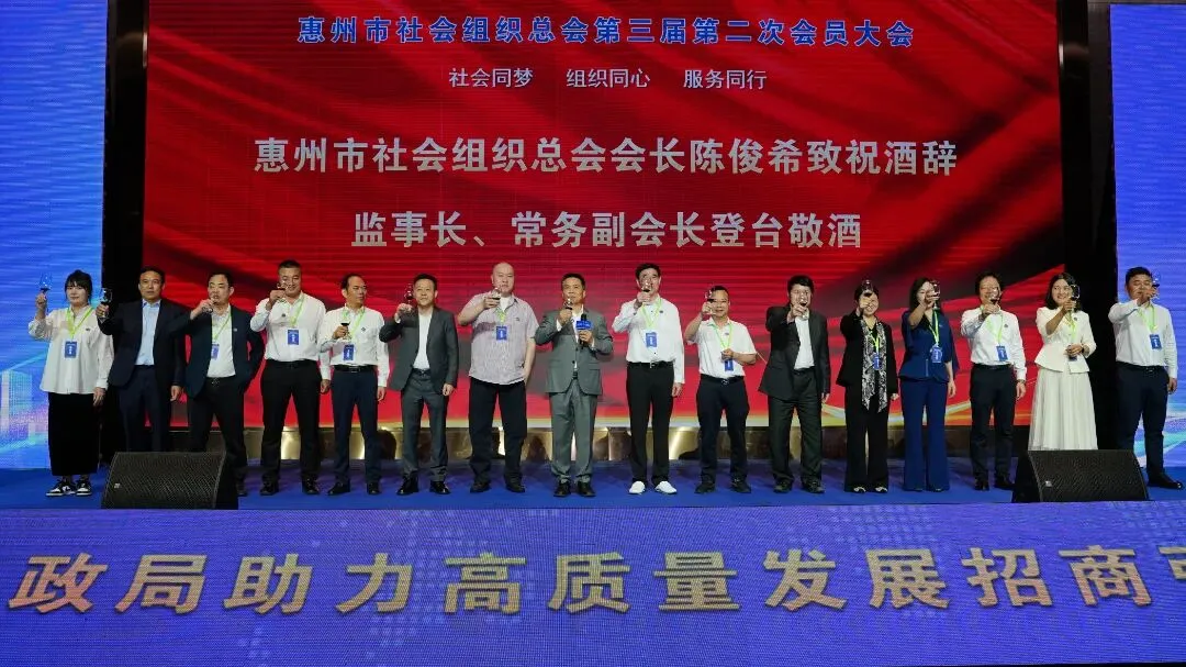 大会尾声,交流晚宴与文艺演出环节温情启幕,惠州市社会组织总会会长陈俊希与总会班子成员一同登台敬酒。