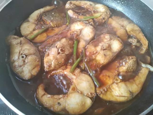 第三步:鱼块煎好之后倒入适量的啤酒稍稍没过鱼块,炖上10分钟左右,然后加入适量的生抽、蚝油和食盐调味,继续炖煮至汤汁浓稠,最后撒上葱花即可出锅。