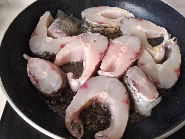 第一步:鱼去鳞鱼内脏,特别是腹中的黑膜一定要去除干净,不然会很腥;处理好之后把鱼剁成合适大小的块,用清水冲洗干净血水,沥干水分备用,水分一定要晾干,或者直接用厨房用纸擦干,不能留有水分,不然待会煎鱼的时候容易溅油,还容易粘锅破皮。