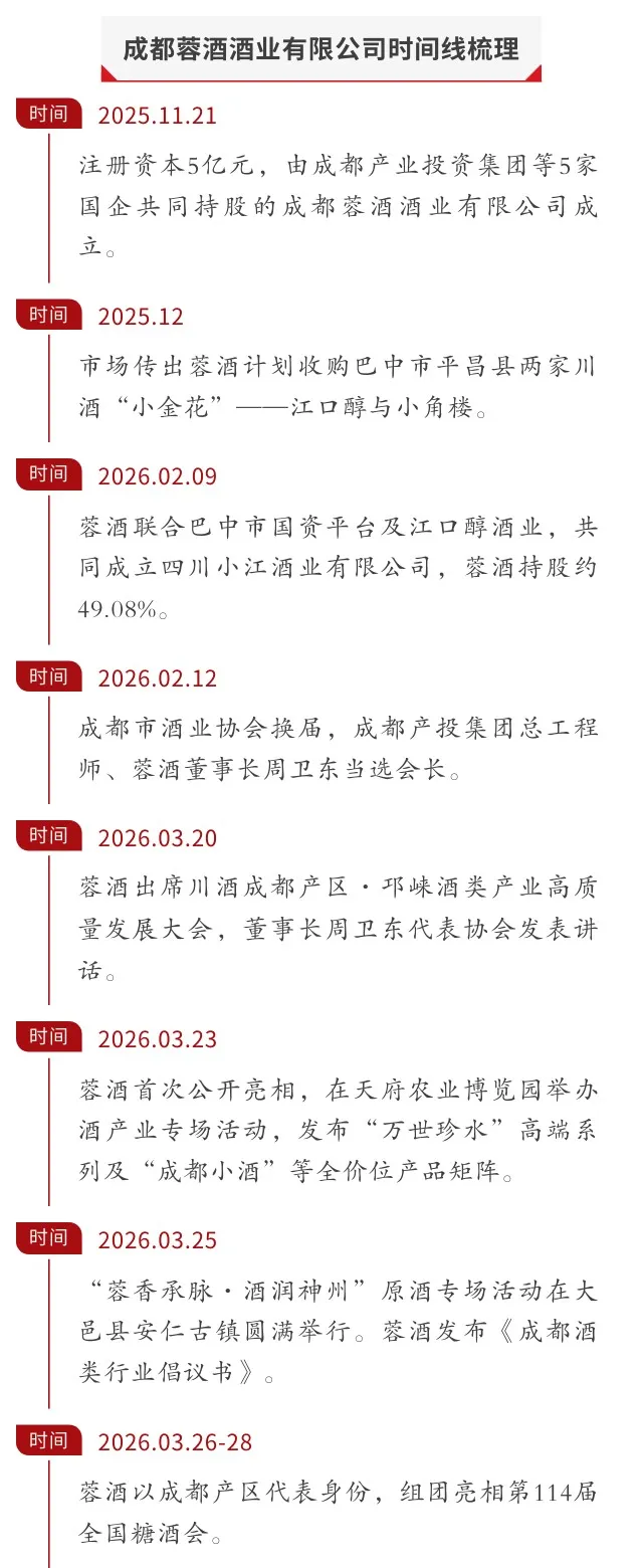 从注册成立到整合巴中两大名酒,从组建合资公司到产区协会“一把手”,再到春糖期间产品发布、全国招商等,短短五个月,这家由成都市国资委实控的“国字队”,以令人目不暇接的速度完成了一场系统性的战略布局。