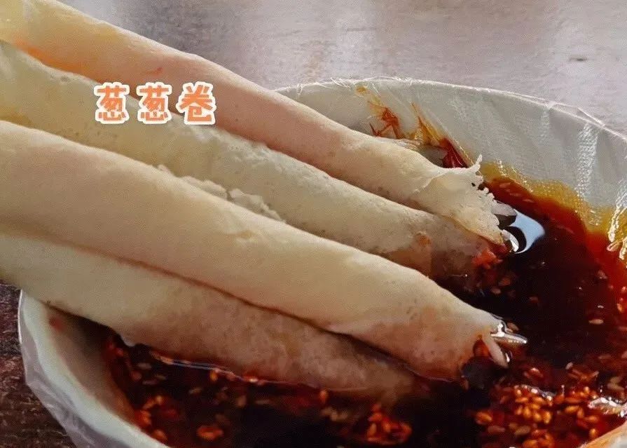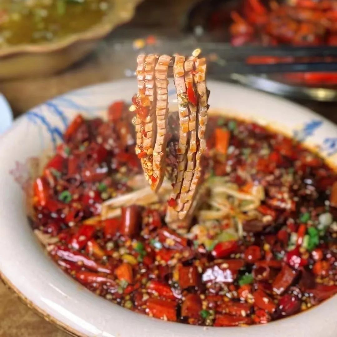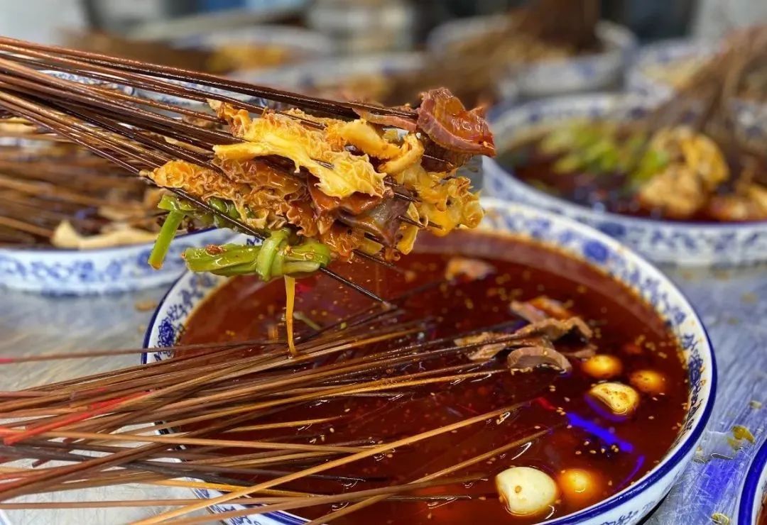 当然还有不容错过的冷串串,冷串串的汤汁是用骨头熬制而成的再加入多种调料和炒熟的芝麻做成的,将菜品放入汤汁中来回翻转。被汤汁浸透全身的串串还滴着红油,味道很浓郁。