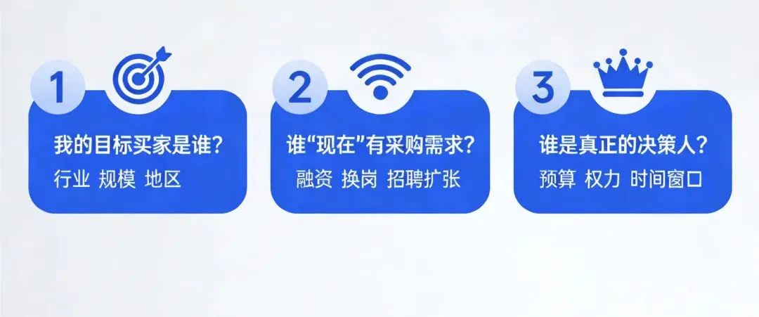 • 潜在客户并不等同于正在采购的客户。关注那些刚完成融资、更换了采购负责人或大量招聘采购岗位的企业,这些信号表明他们更可能在近期下单。