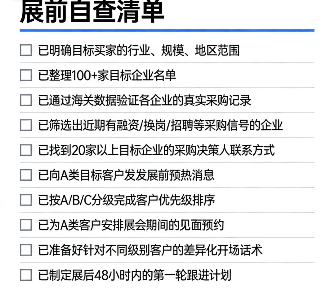 • 不是泛泛的“做外贸的都可以”,而是要具体到行业、规模区间、主要来源国家或地区。目标越具体,你在展会上的判断就越准确。