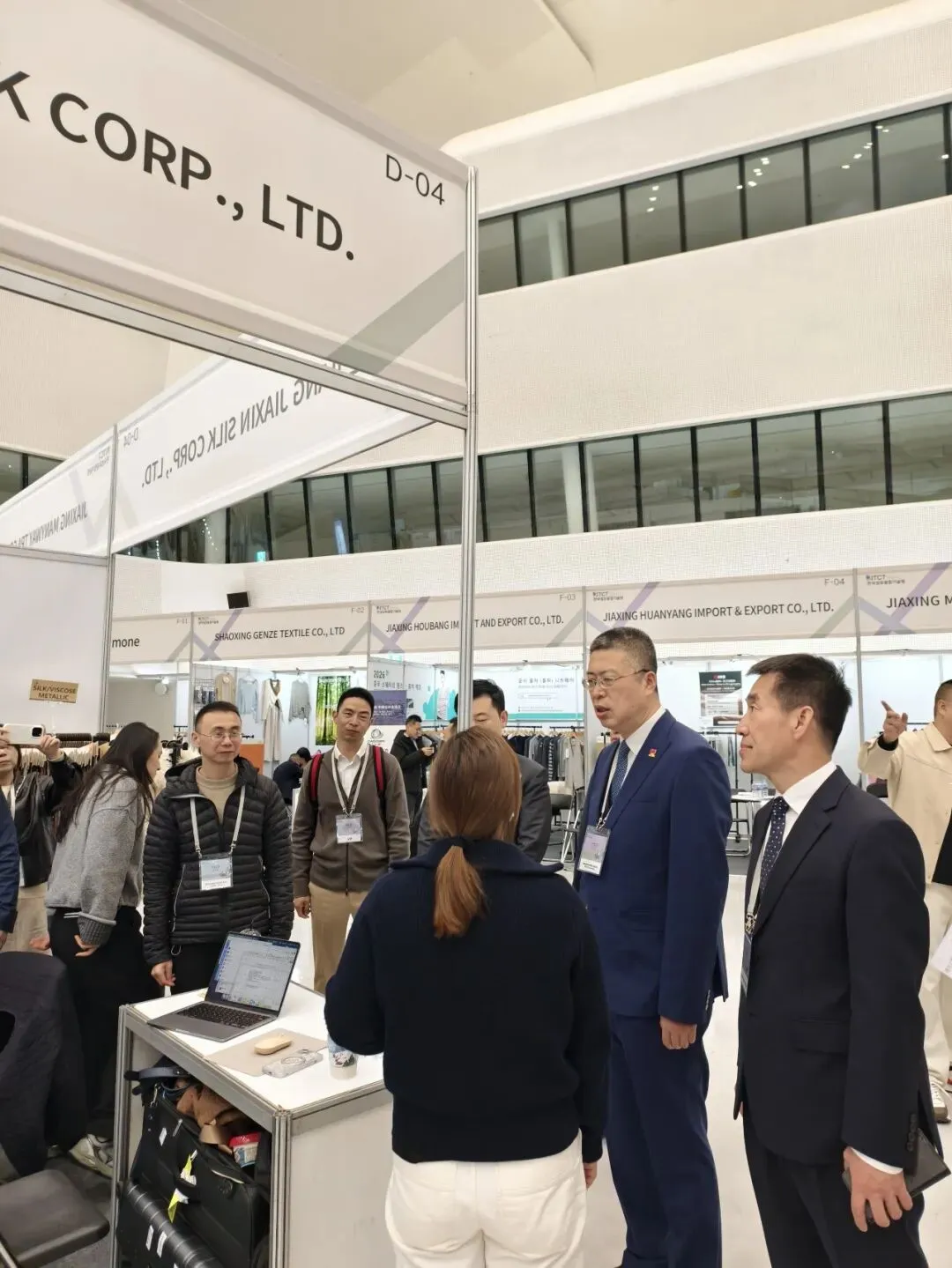 韩国纤维融合技术院理事长李烔来主持开幕式,我局副局长王德阳、中国驻韩国大使馆公使衔参赞王治林、大韩贸易投资振兴公社出口专业委员金康敏、韩国时尚设计联合会会长李相峰等嘉宾出席开幕式并先后致辞。开幕式结束后,中外嘉宾共同巡馆,与参展企业沟通交流。