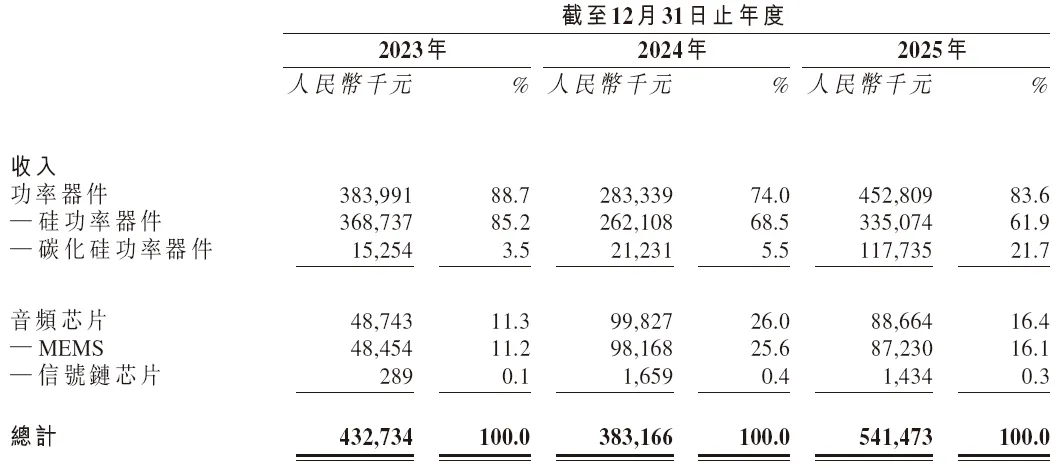招股书显示,2025年瑶芯微收入5.41亿元,其中功率器件收入4.53亿元,占比83.6%。碳化硅功率器件收入1.18亿元,占总收入的21.7%,较2024年的2123.1万元大幅跃升,说明SiC在它内部已经从“储备业务”变成了“可见增长项”。