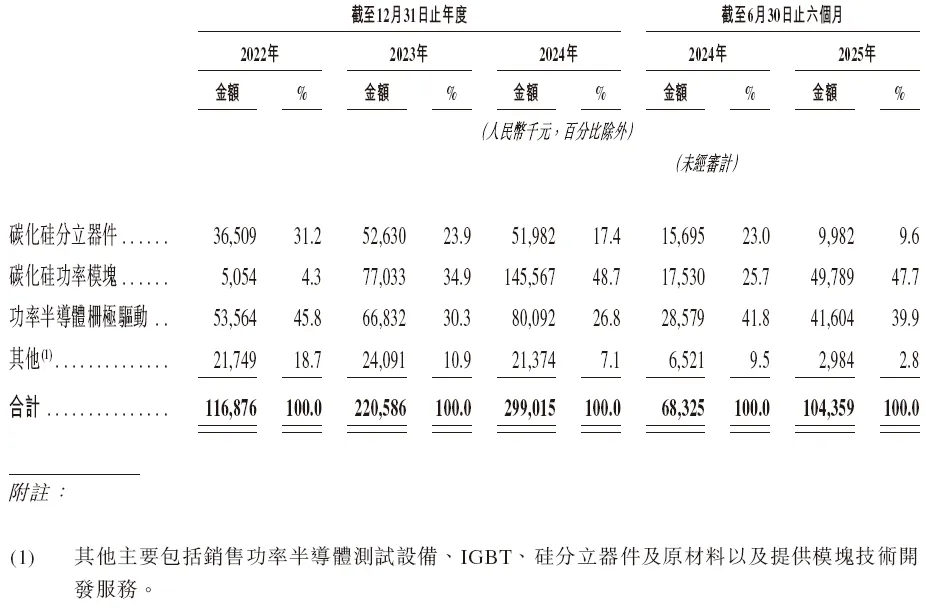 与之对应的,基本半导体代表的是另一条完全不同的器件路径:重模式、全链条、IDM。它在招股书里强调自己是中国唯一一家整合碳化硅芯片设计、晶圆制造、模块封装及栅极驱动设计与测试能力的企业。产品组合也更“器件公司化”——分立器件、车规级和工业级SiC功率模块、栅极驱动,覆盖新能源汽车、储能、工业控制、数据及服务器中心等多个场景。