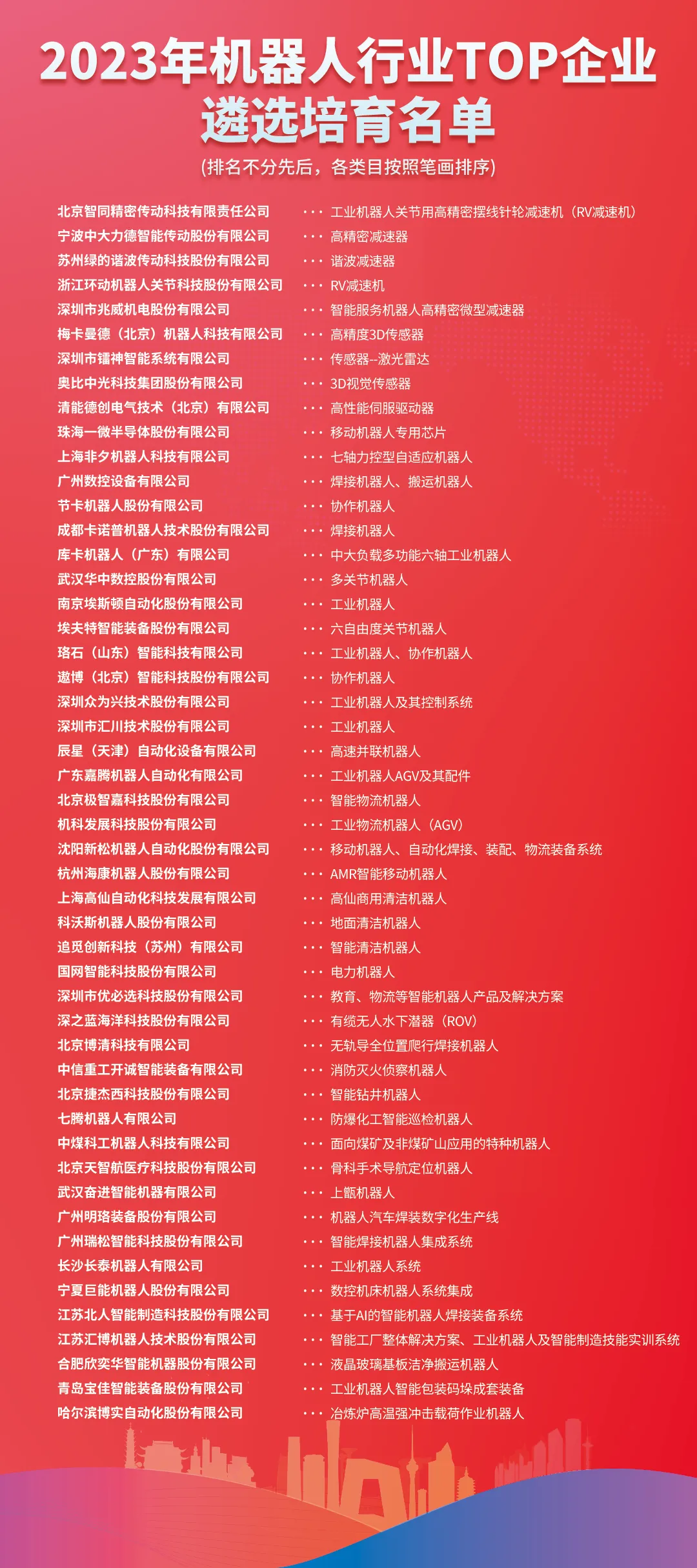 经过社会公示,会议当天,正式发布2023年机器人行业TOP企业遴选培育名单,包括覆盖机器人零部件生产制造企业、工业/服务/特种机器人整机生产制造企业、机器人集成应用企业共50家。机器人行业 TOP 企业遴选培育工作将每年开展一次,并建立动态管理机制,以形成一批支撑我国机器人产业高质量发展的主力军,持续提高骨干企业发展质量与水平,引导企业不断向制造业单项冠军提升迈进。