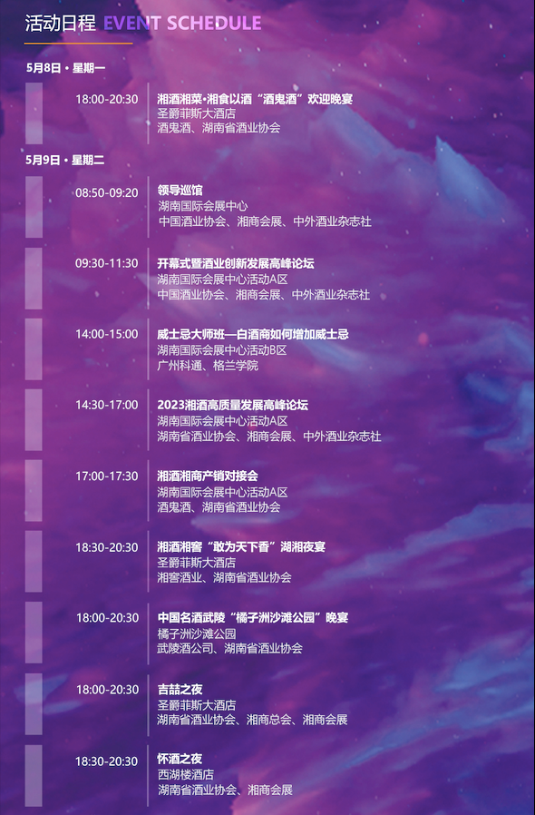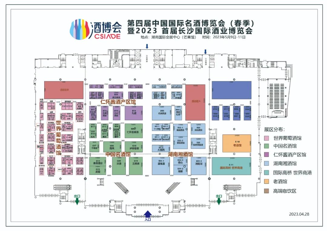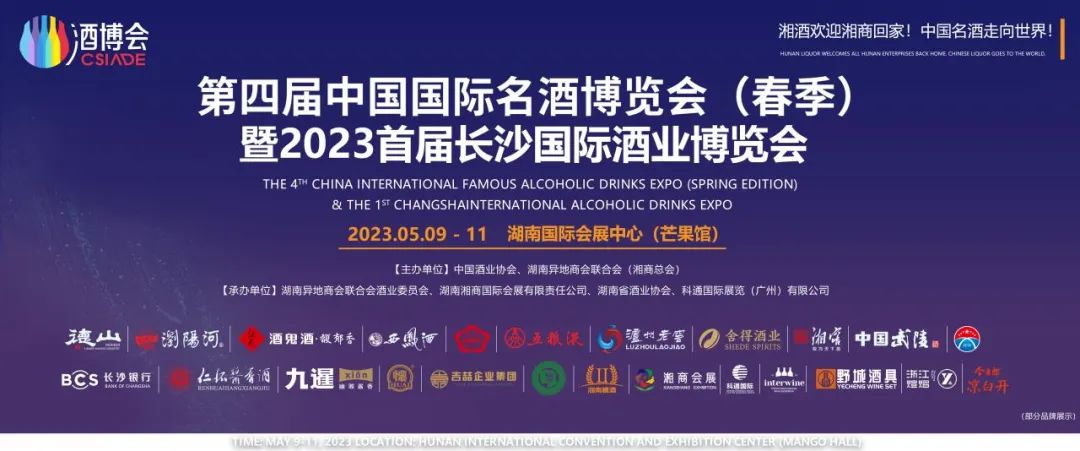 由湖南省商务厅、长沙市人民政府、常德市人民政府、邵阳市人民政府、湘潭市人民政府、湘西土家族苗族自治州人民政府共同支持,中国酒业协会、湖南异地商会联合会(湘商总会)主办的第四届中国国际名酒博览会(春季)暨2023首届长沙国际酒业博览会(以下简称“酒博会”)将于2023年5月9日-11日在湖南国际会展中心(芒果馆)举行。