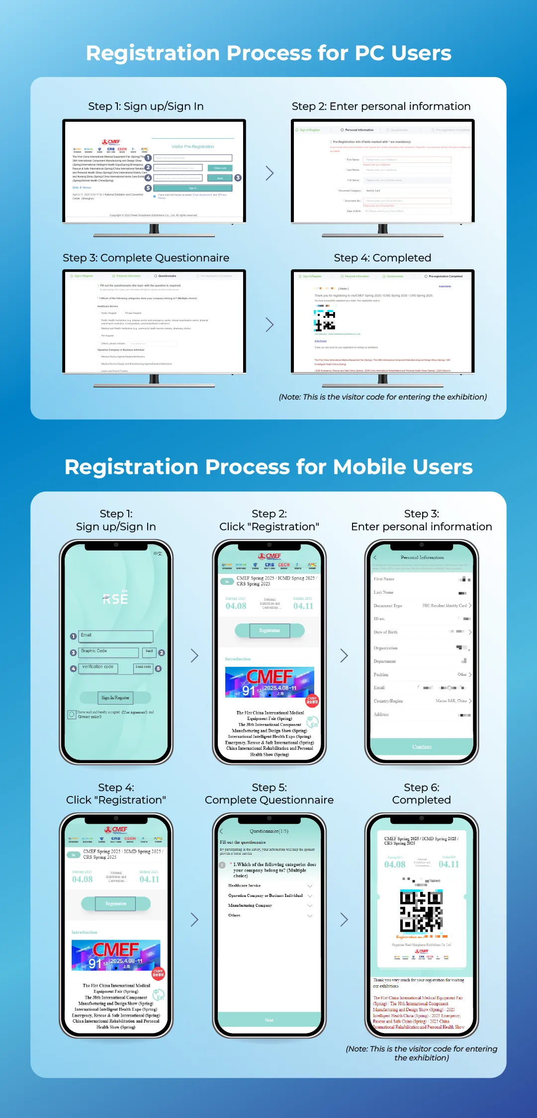 1、根据国家相关规定,第93届CMEF所有参展人员需进行实名登记,主办方依照相关法律法规要求将对您的个人信息将严格保密,请放心填写!