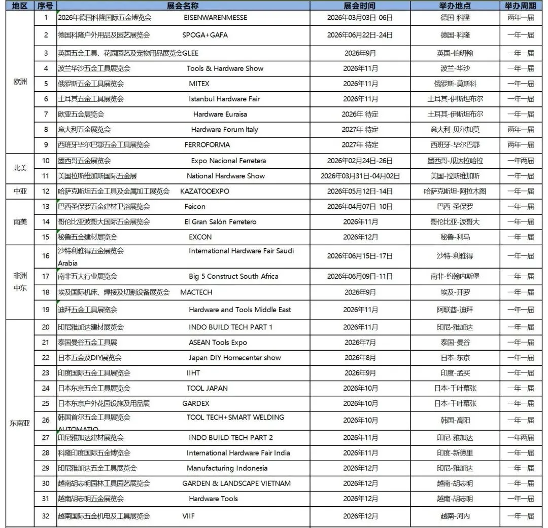 2026年全球五金展会计划表