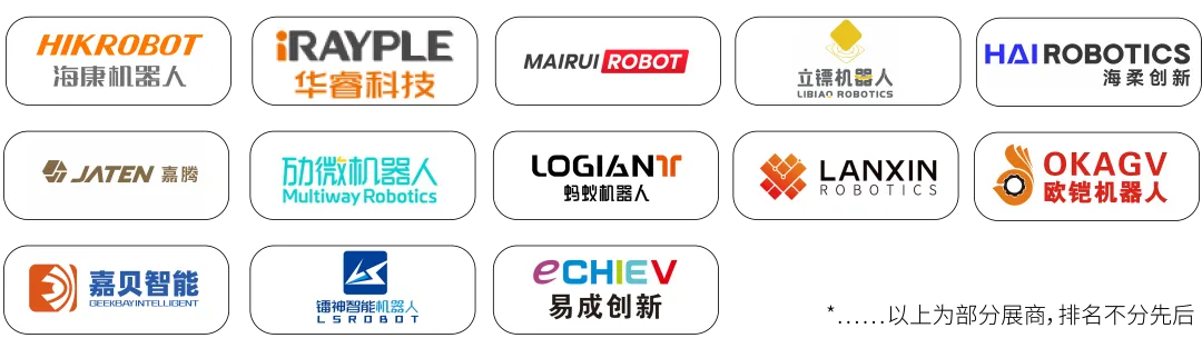 海康机器人、华睿科技、立镖机器人、迈睿机器人、海柔创新、嘉腾机器人、劢微机器人、蓝芯科技、镭神智能机器人、欧铠机器人、蚂蚁机器人、嘉贝智能、易成创新……