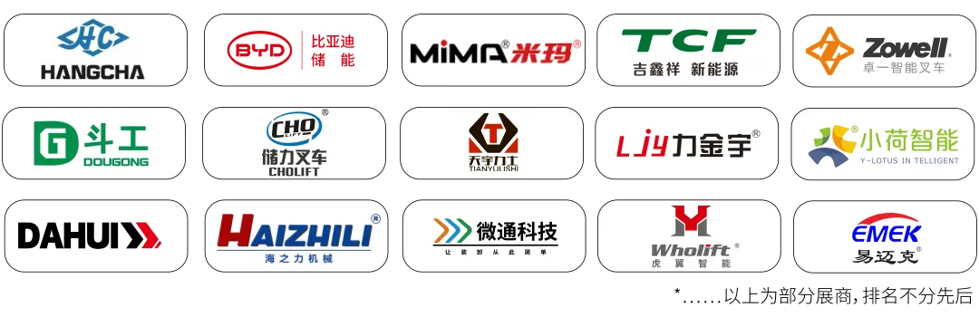 杭叉、比亚迪、搬易通、卓一叉车、吉鑫祥、储力叉车、天宇、斗工、宇捷智能、小荷智能、虎翼智能、海之力、易迈克、大汇智能、微通智能科技……